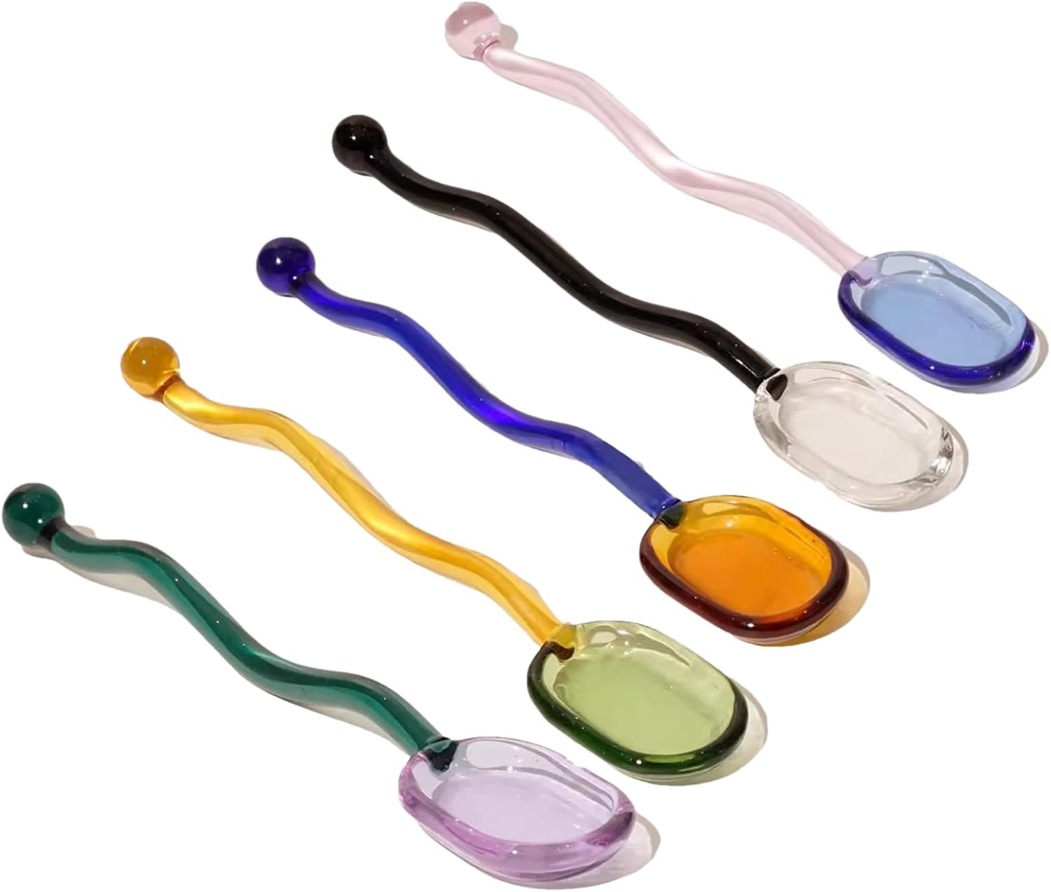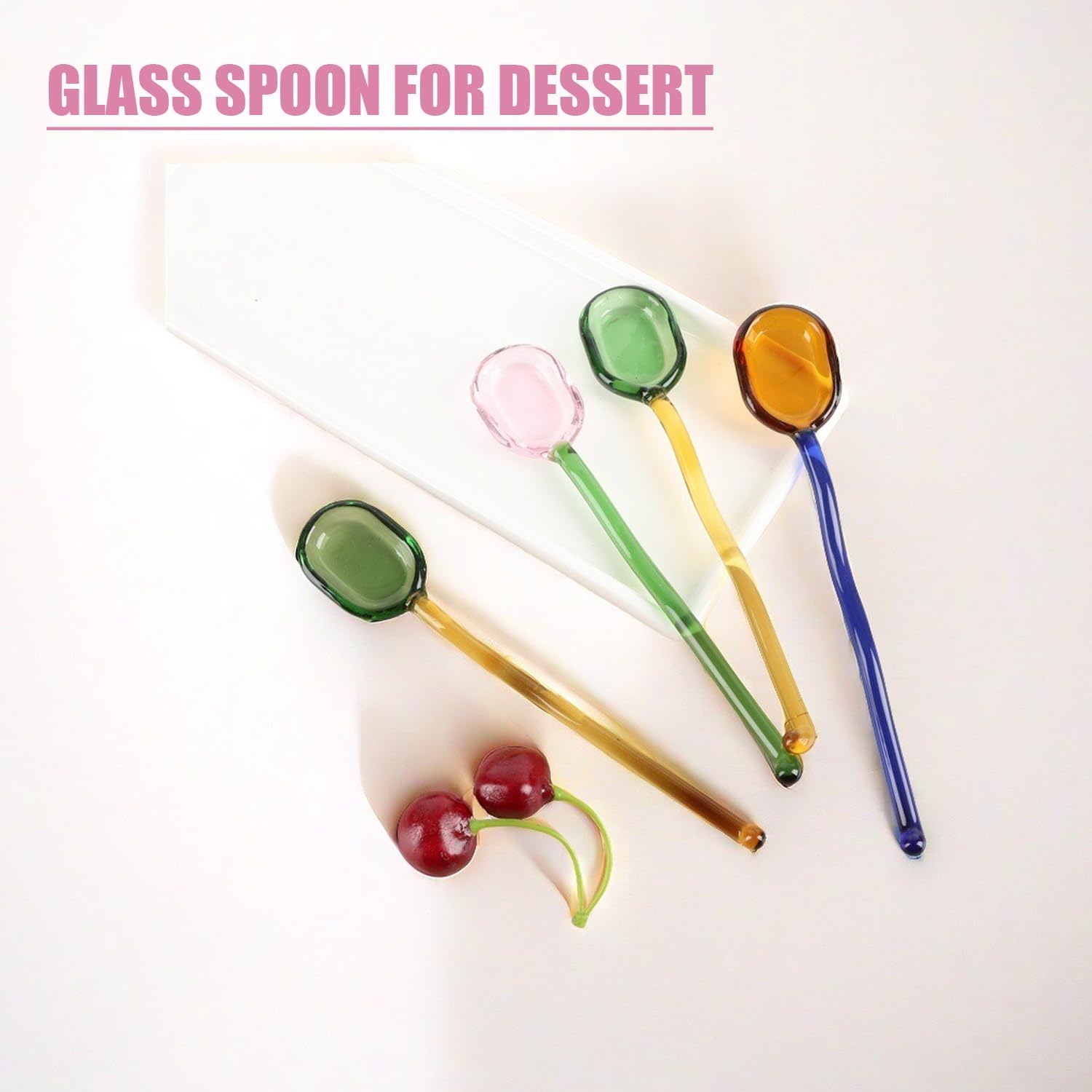 - - [STYLISH DESIGN] Our elegant glass teaspoons feature a curvy handle and come in different colors (transparent, pink, blue, green and amber) to match any tableware.