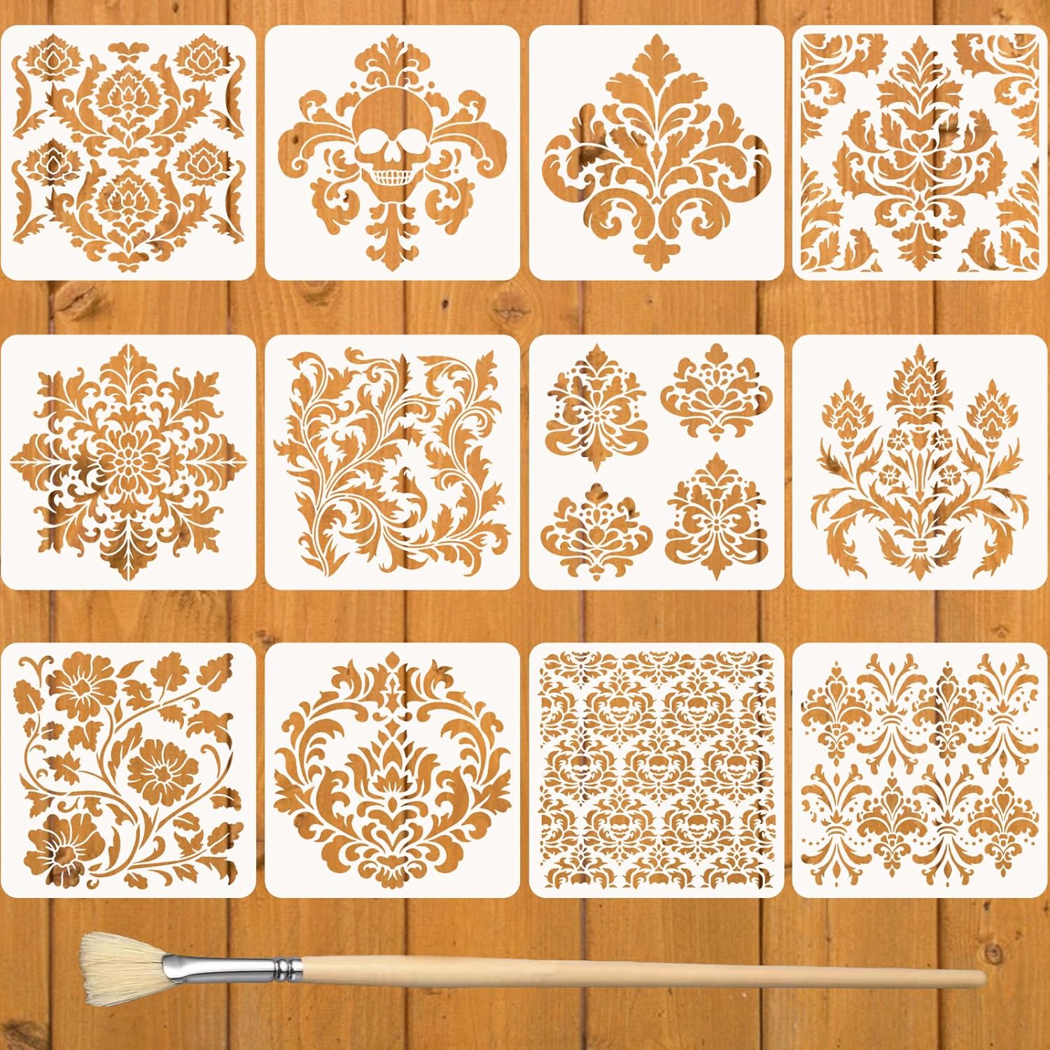 12PCS Large Mandala Stencils 12 x 12 Inch Damask Stencils for Walls Large Texture Drawing Templates with Brushes Mandala Templates for Painting on Wood Furniture Canvas Paper Fabric
