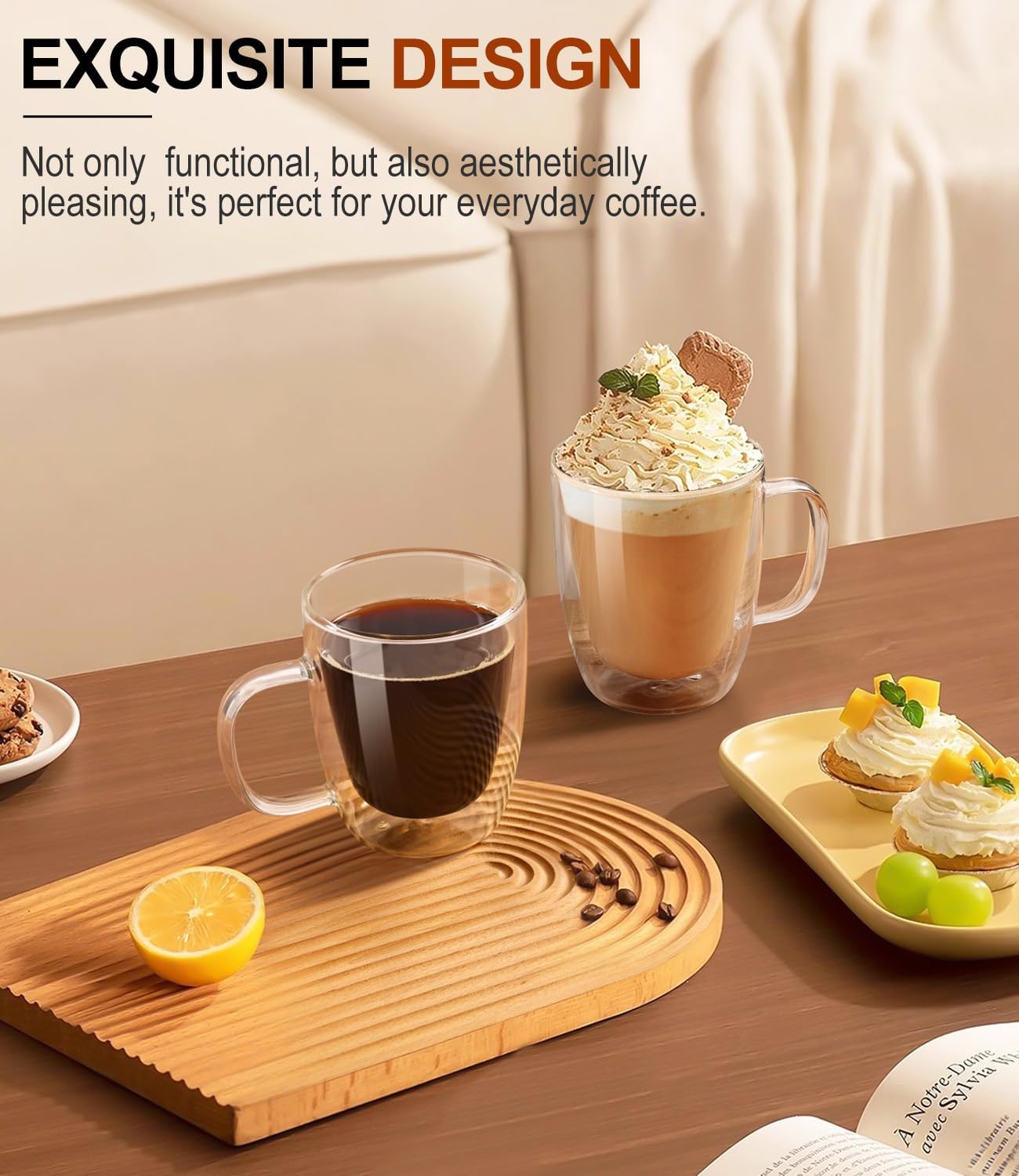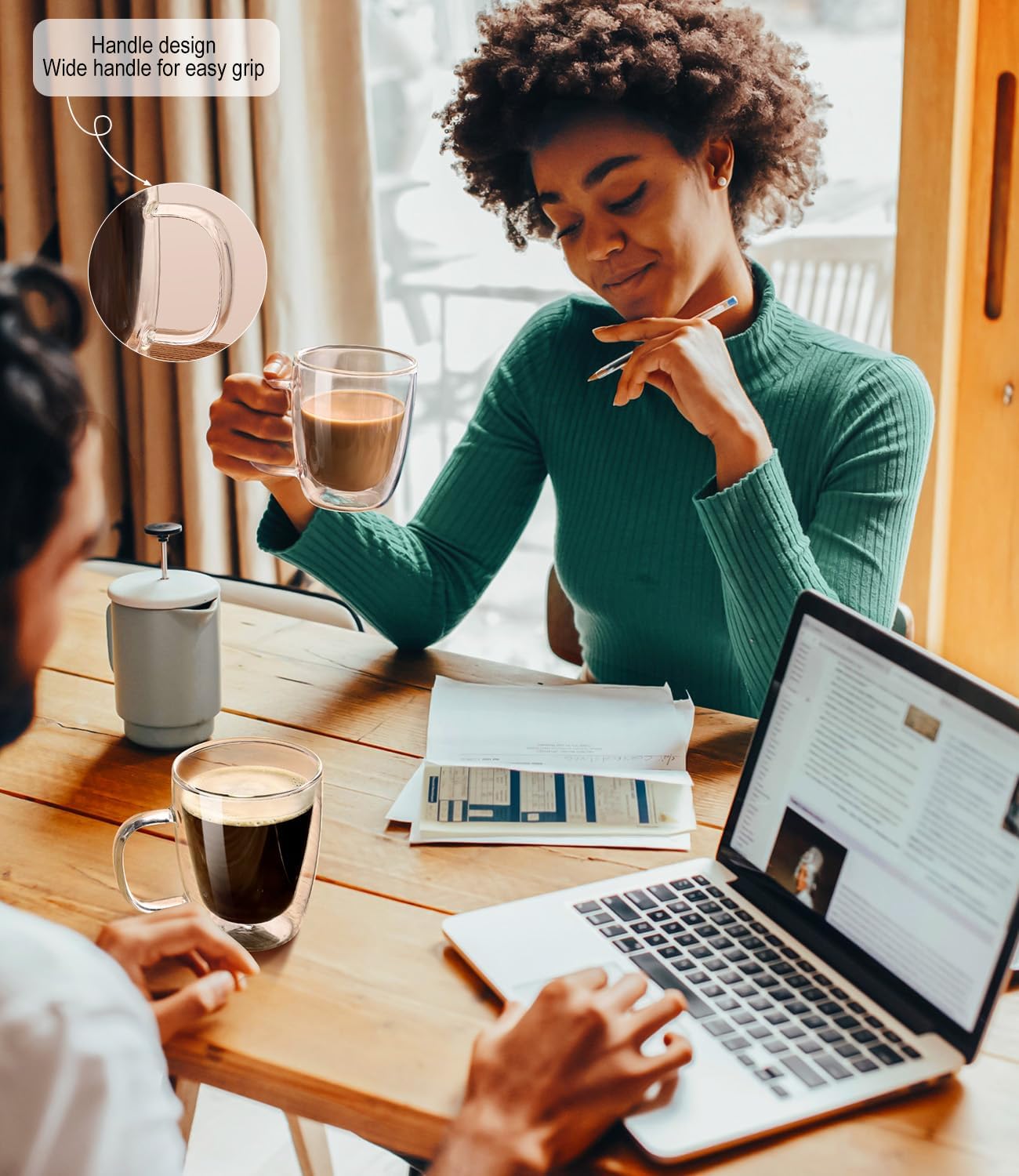 - Unique double layer design-These clear glass coffee mugs feature a double-wall vacuum insulation design that's as functional as it is beautiful. With sturdy handles that are hard to drop and easy to grasp, not only do they stay warmer for longer (up to 30-35 minutes), but the glass keeps you cool to the touch and you can enjoy every sip of coffee! Never burn your hands.