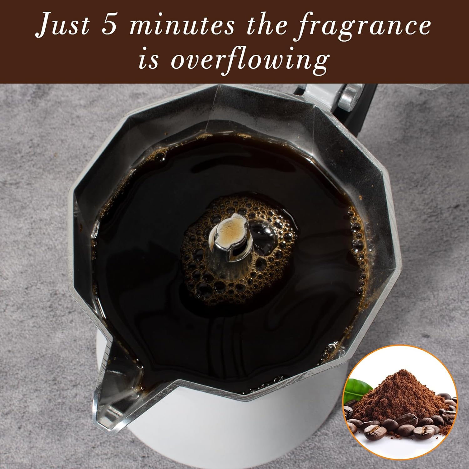 - 【6-Cup Moka Pot (300ml)】 – Ideal for Rich, Authentic Espresso.This classic stovetop brewer makes 6 servings (about 1.75oz each) – the traditional Italian way to enjoy strong, aromatic coffee. The 300ml capacity is designed for small espresso cups (not standard mugs), delivering concentrated flavor in every drop. Pro tip: Fill the base with water just below the safety valve, use finely ground coffee (no tamping!), and brew over medium heat for best results.