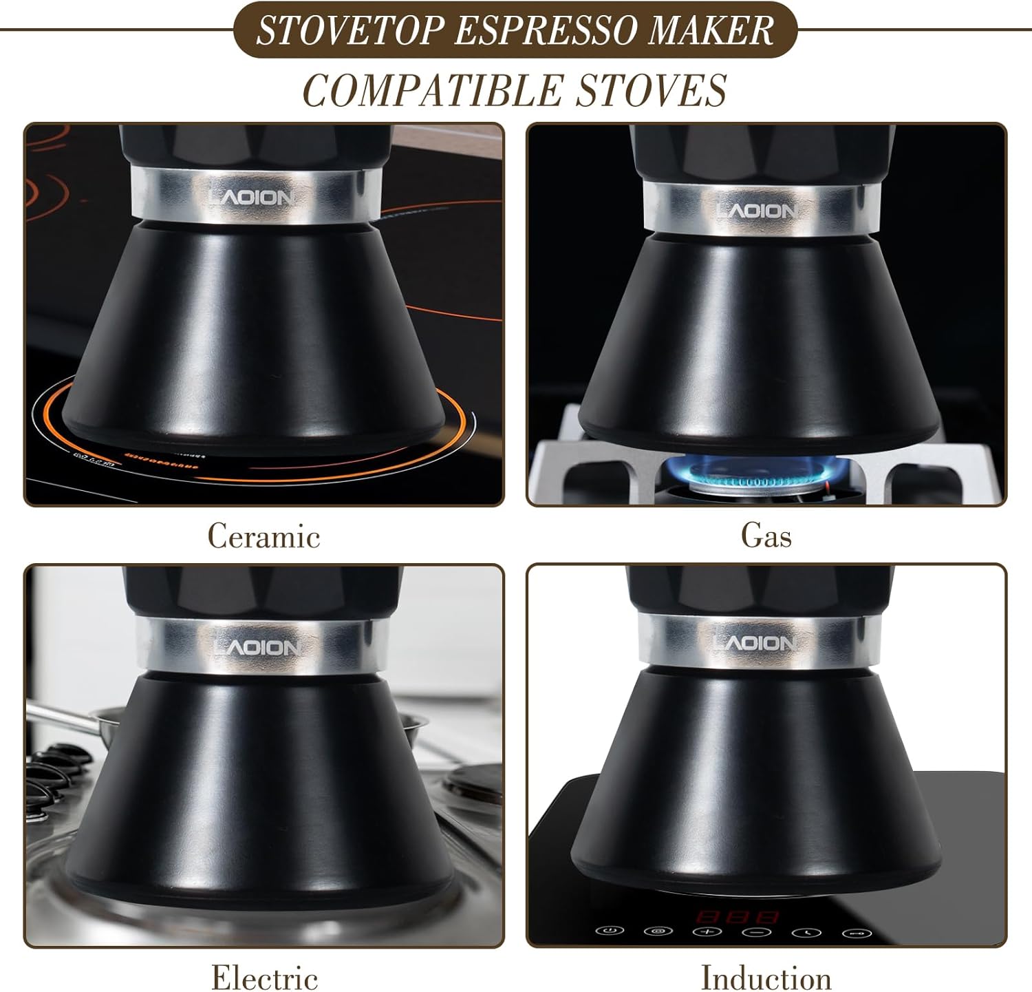 - 【 Induction Cooker Compatibility 】 The bottom of the Moka pot features an innovative design that heats efficiently and evenly, making it compatible with various stove types. Whether it’s a gas stove, induction cooker, or electric ceramic stove, it works well, eliminating concerns about compatibility with your coffee pot.