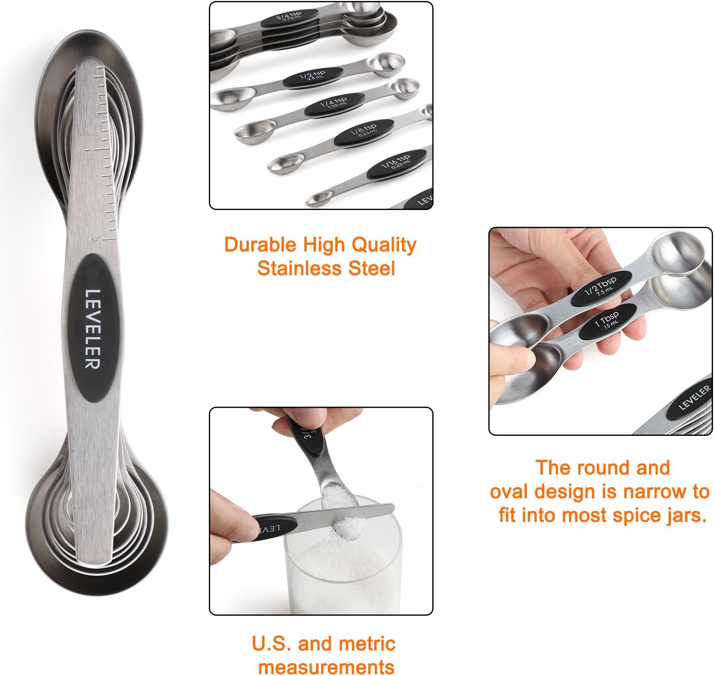 - 【 Magnetic Measuring Spoons 】double-sided Magnetic Measuring spoons cater to all your measuring needs. The oval end fits into spice jars, and the rounded end is ideal for liquids. With a flat base to prevent spills and a cup with a liquid pouring spout, guarantees precise measurements