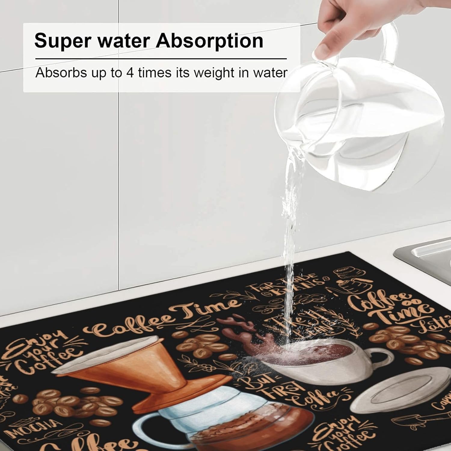 Fun Coffee Dish Drying Mat, Highly Absorbent Microfiber Kitchen Counter Pad Reusable Washable, 18*24"