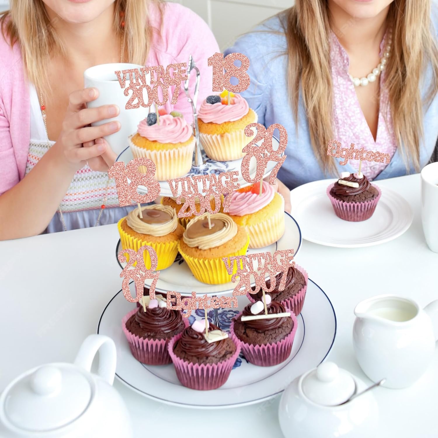 Gyufise 24Pcs 18th Birthday Cupcake Toppers Glitter Eighteen Vintage 2007 Hello 18 Years Birthday Cupcake Picks Adultish 18 Cake Decoration for Happy 18th Birthday Anniversary Party Supplies Rose Gold