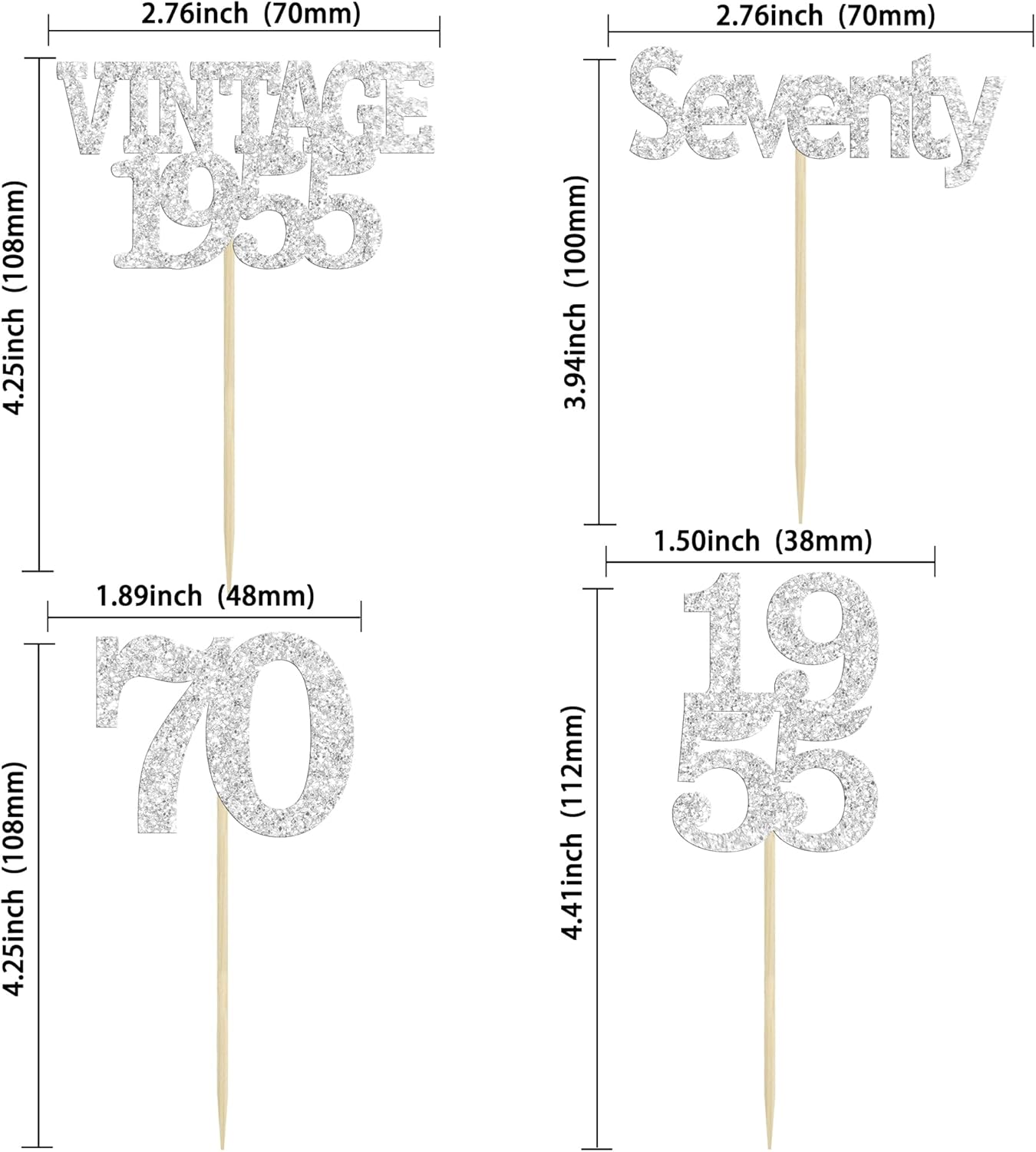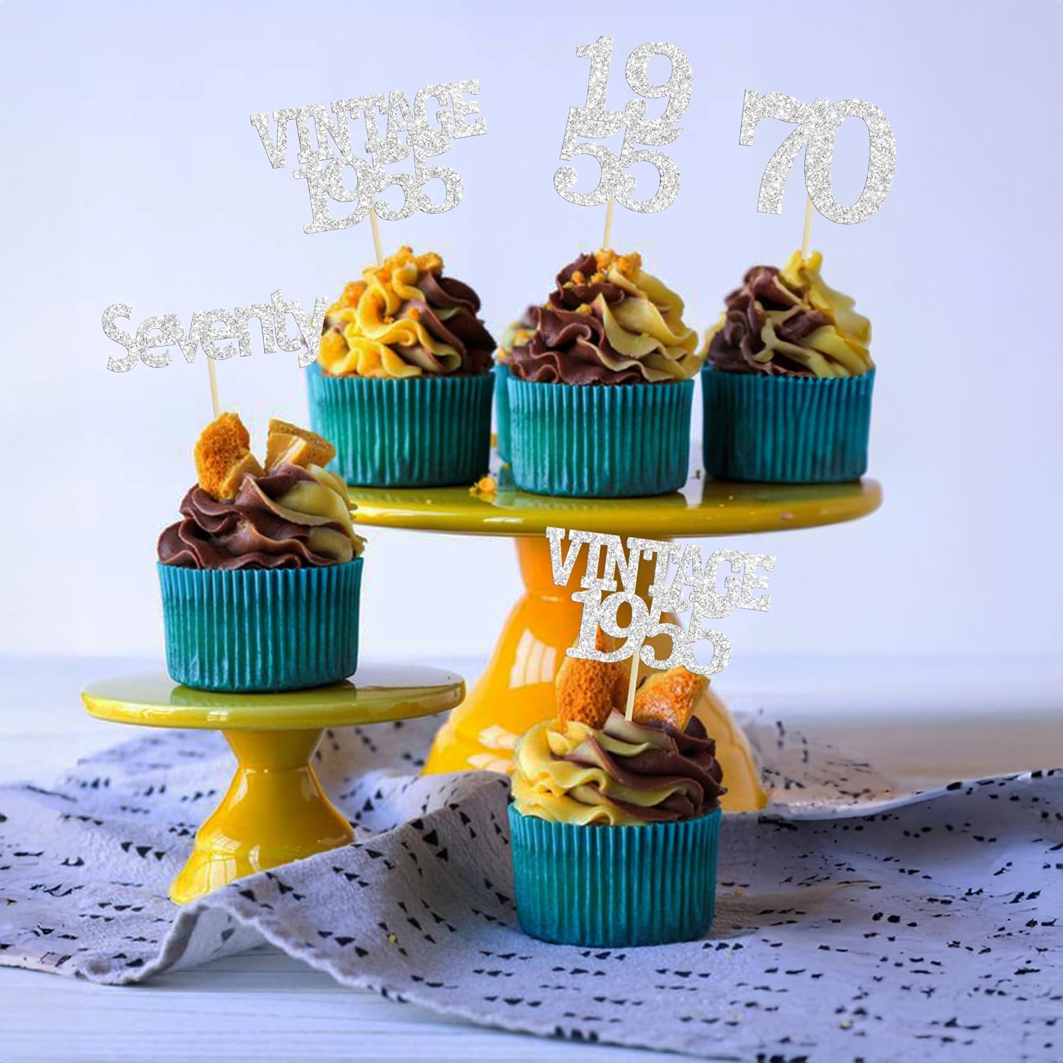 Gyufise 24Pcs 70th Birthday Cupcake Toppers Glitter Cheers to 70 Fabulous Seventy Vintage 1955 Cupcake Picks 70th Birthday Wedding Anniversary Party Cake Decorations Supplies Silver