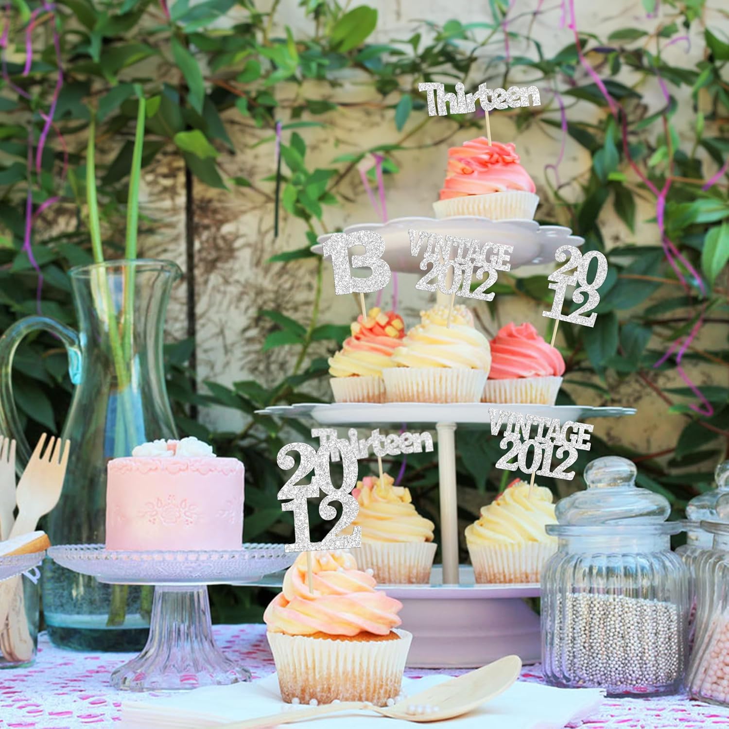 Gyufise 24Pcs 13th Birthday Cupcake Toppers Glitter Thirteen Vintage 2012 Hello 13 Years Birthday Cupcake Picks Official Teenager 13 Cake Decorations for Happy 13th Anniversary Party Silver