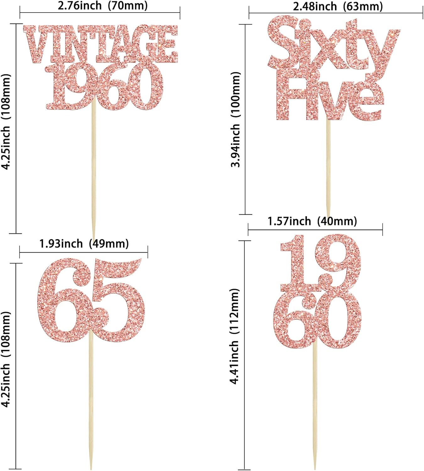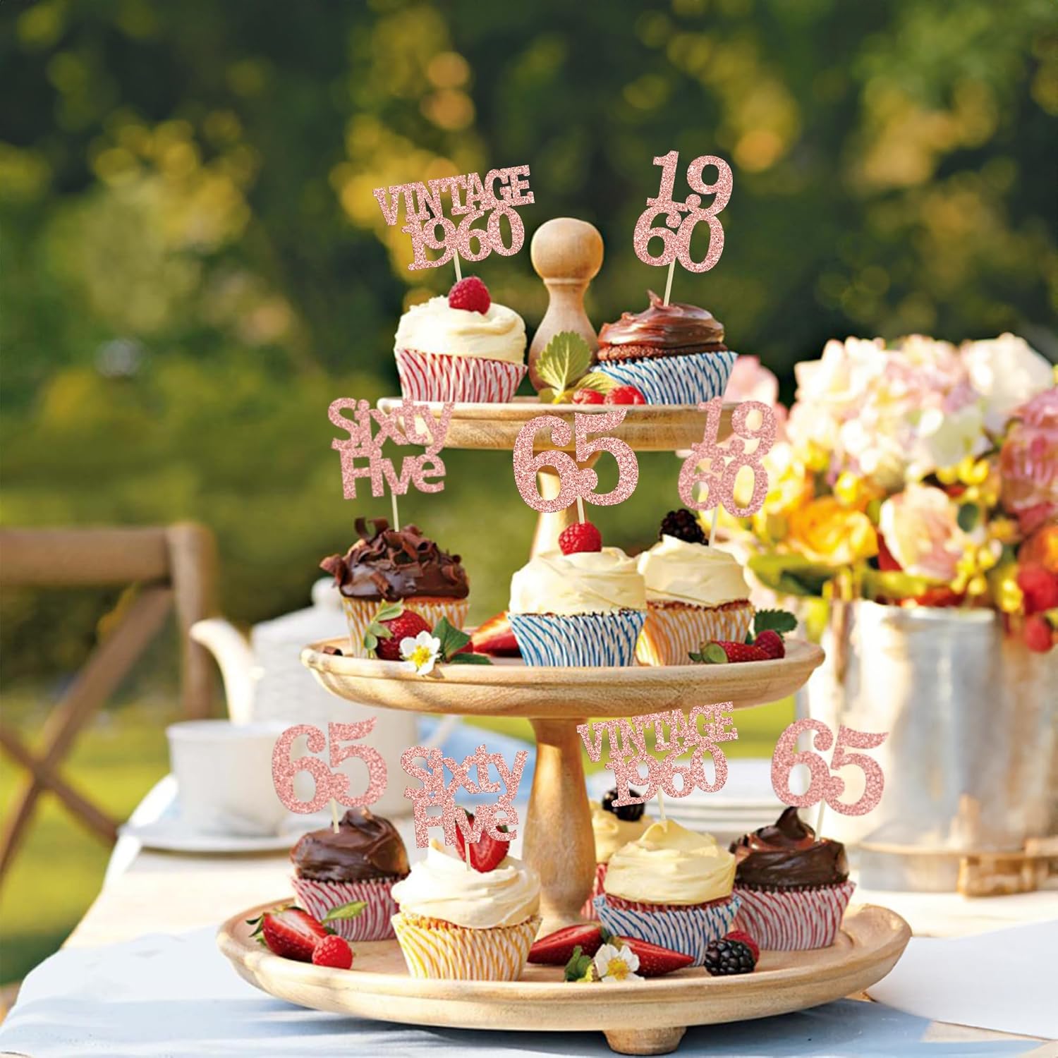 Gyufise 24Pcs 65th Birthday Cupcake Toppers Glitter Cheers to 65 Fabulous Sixty Five Vintage 1960 Cupcake Picks 65th Birthday Wedding Anniversary Party Cake Decorations Supplies Rose Gold