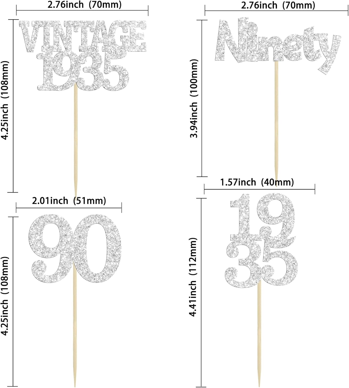 Gyufise 24Pcs 90th Birthday Cupcake Toppers Glitter Cheers to 90 Fabulous Ninety Vintage 1935 Cupcake Picks 90th Birthday Wedding Anniversary Party Cake Decorations Supplies Silver