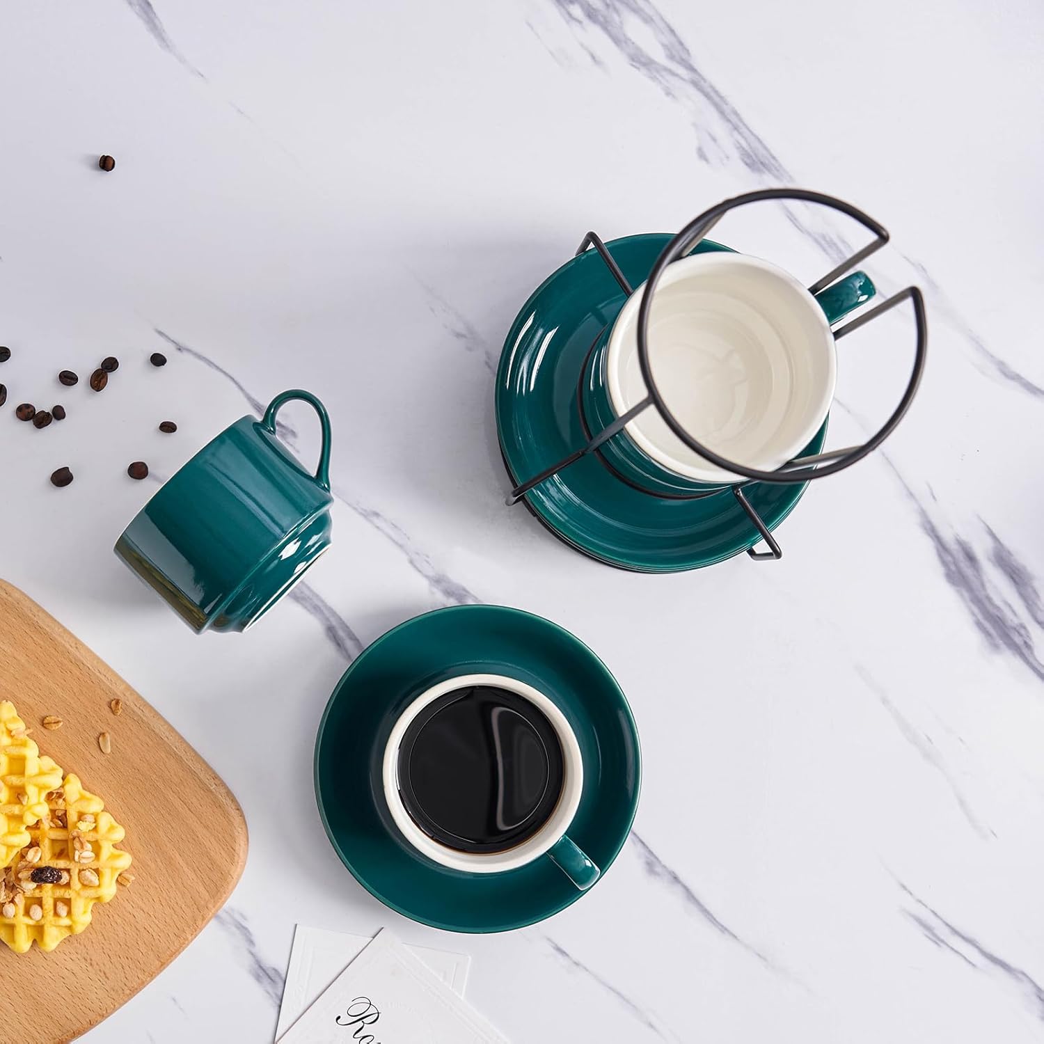 - 1. Elevate your kitchen experience with the YOLIFE Cappuccino Cups Set of 4. This set includes 4pcs 8 Ounce Cappuccino Cups with Saucers and Metal Stand, all in a classic ceramic green color. Perfect for people who enjoy coffee and conversation!