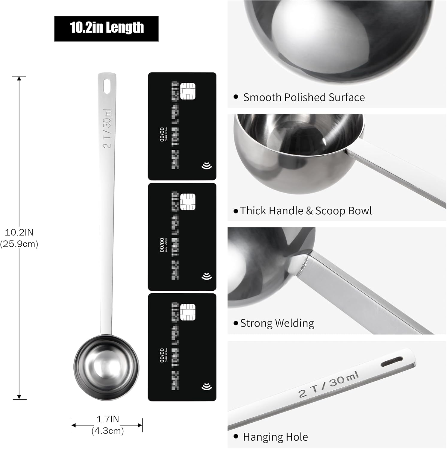 - [Why does Doosu design coffee spoon with a long handle?] Doosu 10.2in long spoon with 8.5in handle allows for easy reach into deep canisters or tall jars. No need to tip the container or dig around awkwardly, making it easier to scoop out ingredients without spilling. Unlike short-handled scoops that tend to slip into the container, our long handle tablespoon scoop always within easy reach. With a hanging hole, the coffee measuring scoop stores neatly on kitchen hooks.