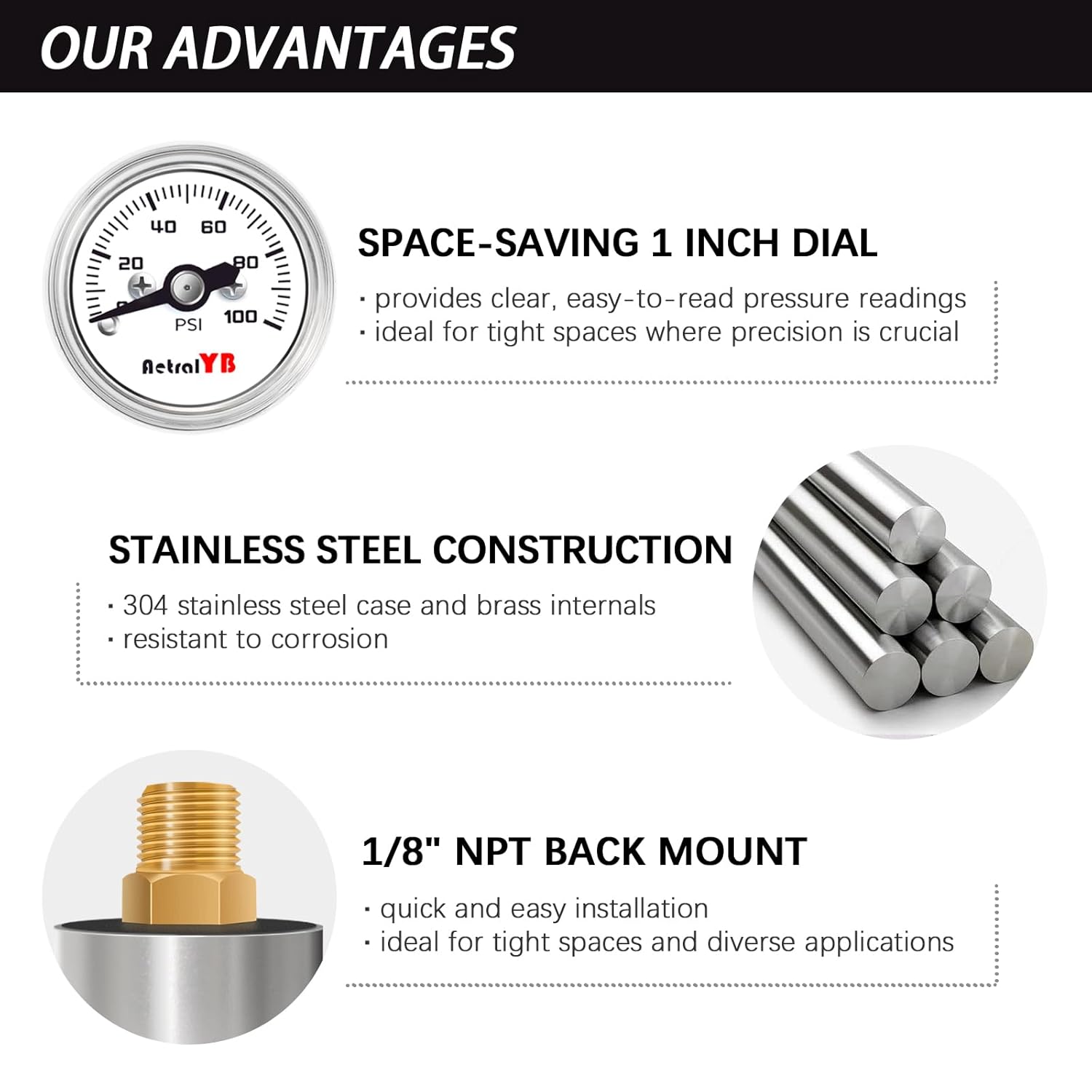 - STAINLESS STEEL BUILD: Built with a robust 304 stainless steel case and brass internals, this air pressure gauge is resistant to corrosion, providing long-lasting performance in harsh environments.