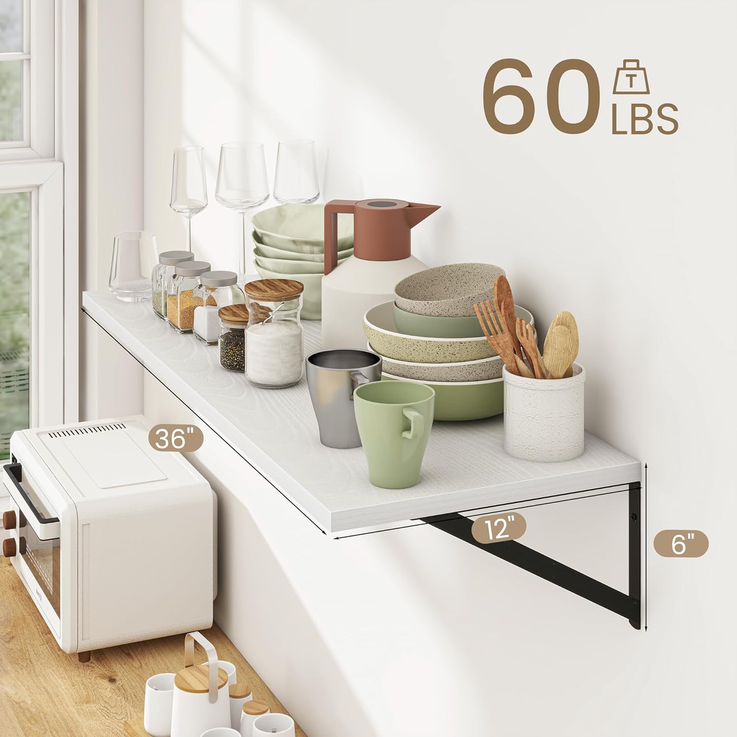 - Large Floating Shelves: Our versatile rustic wall shelves measure 36&12 inch floating shelves, offering generous storage or display space for any room in your home—be it the kitchen, living room, bedroom, bathroom, laundry room, and so on. With ample surface area, you can easily store or display items like books, collectibles, plants, crafts, photos, laundry supplies, and more.