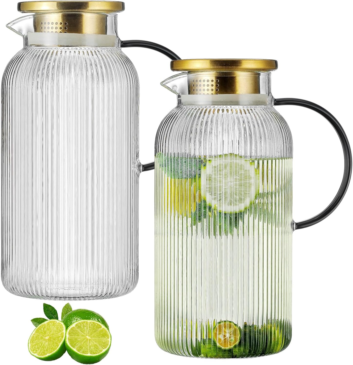 2 PACK Glass Pitcher with Lid,68 oz/ 2 Liter Vertical Stripes Water Pitcher With Black Handle,Glass Water Carafe for Cold Brew,Coffee, Lemonade, Iced Sun Tea,Beverage, Milk Heat Resistant