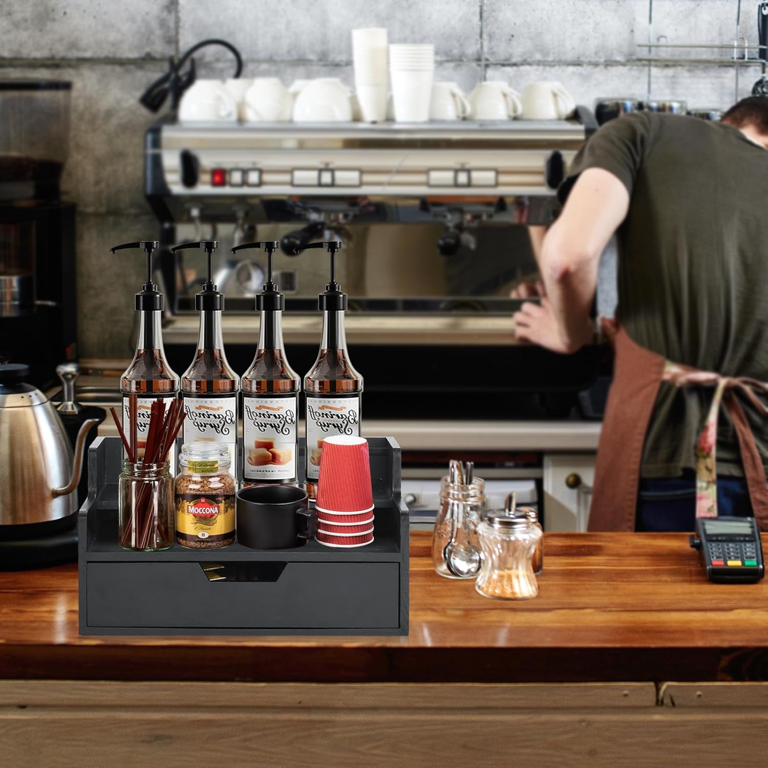 - ☕【Large Capacity Coffee Station】This Coffee station organizer offers generous storage for tea bags, coffee syrups, cup lids, coffee pods, stir sticks, disposable cups, and more. Its practical size makes it a great fit for any countertop or breakroom.