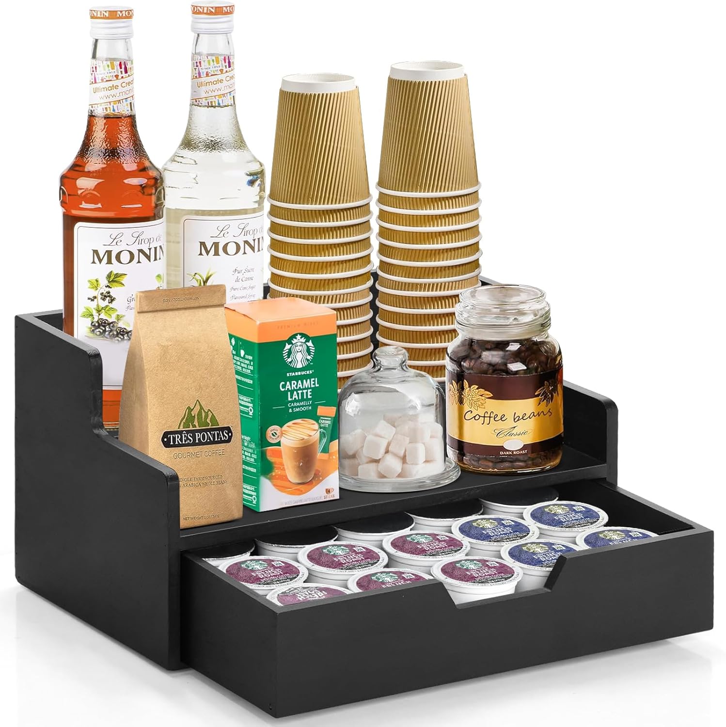 - ☕【Spacious Storage with Drawer】Our 3-tier coffee syrup organizer can stand 8 syrup bottles and has one pull-out drawer that can store 25 coffee capsules. Stepped design allows for neat placement and easy access to your favorite syrup. Ideal for use on home kitchen counters, office lounge areas, this coffee station organizer allows coffee or tea to be easily organized and replenished as needed.