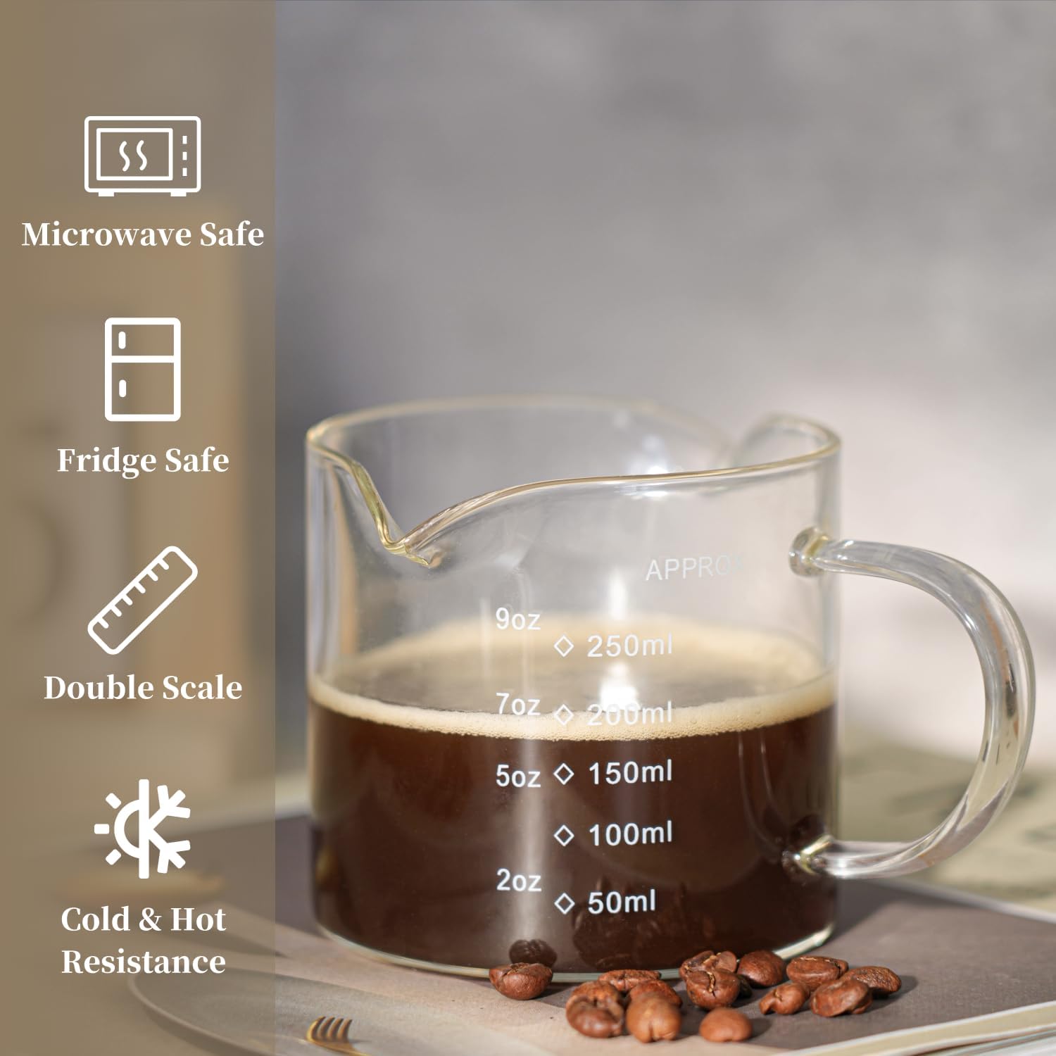 - Double V-Shaped Spout & Dual scales Design: The large V-shaped drainage nozzle is more convenient to pour and not easy to leak. So, glass measuring cup can pour smoothly without staining the tabletop and it is a good helper for your coffee. There are two clear and accurate scales on the body of the espresso cups, ounces and milliliters. The large capacity of 250ml allows you to fill 2 servings of espresso at one time.