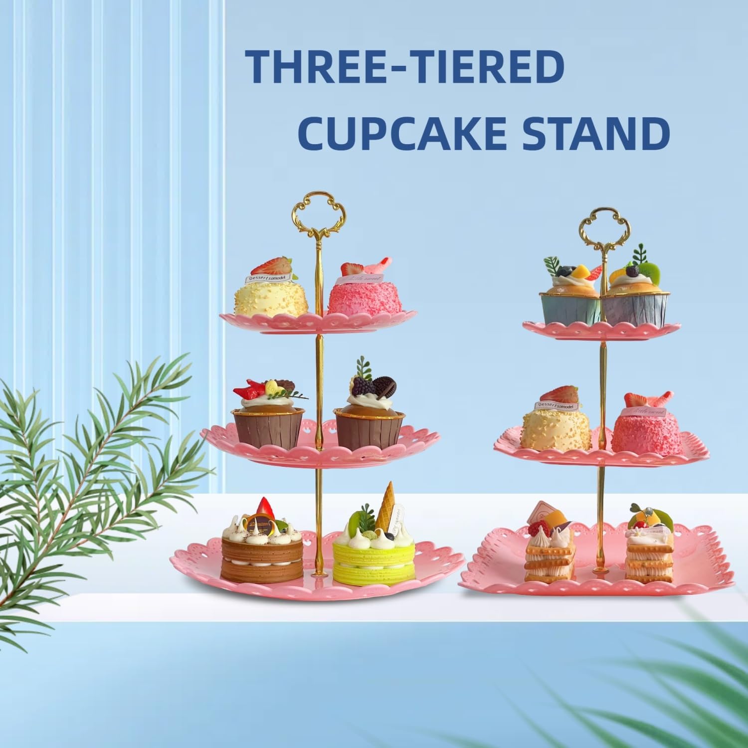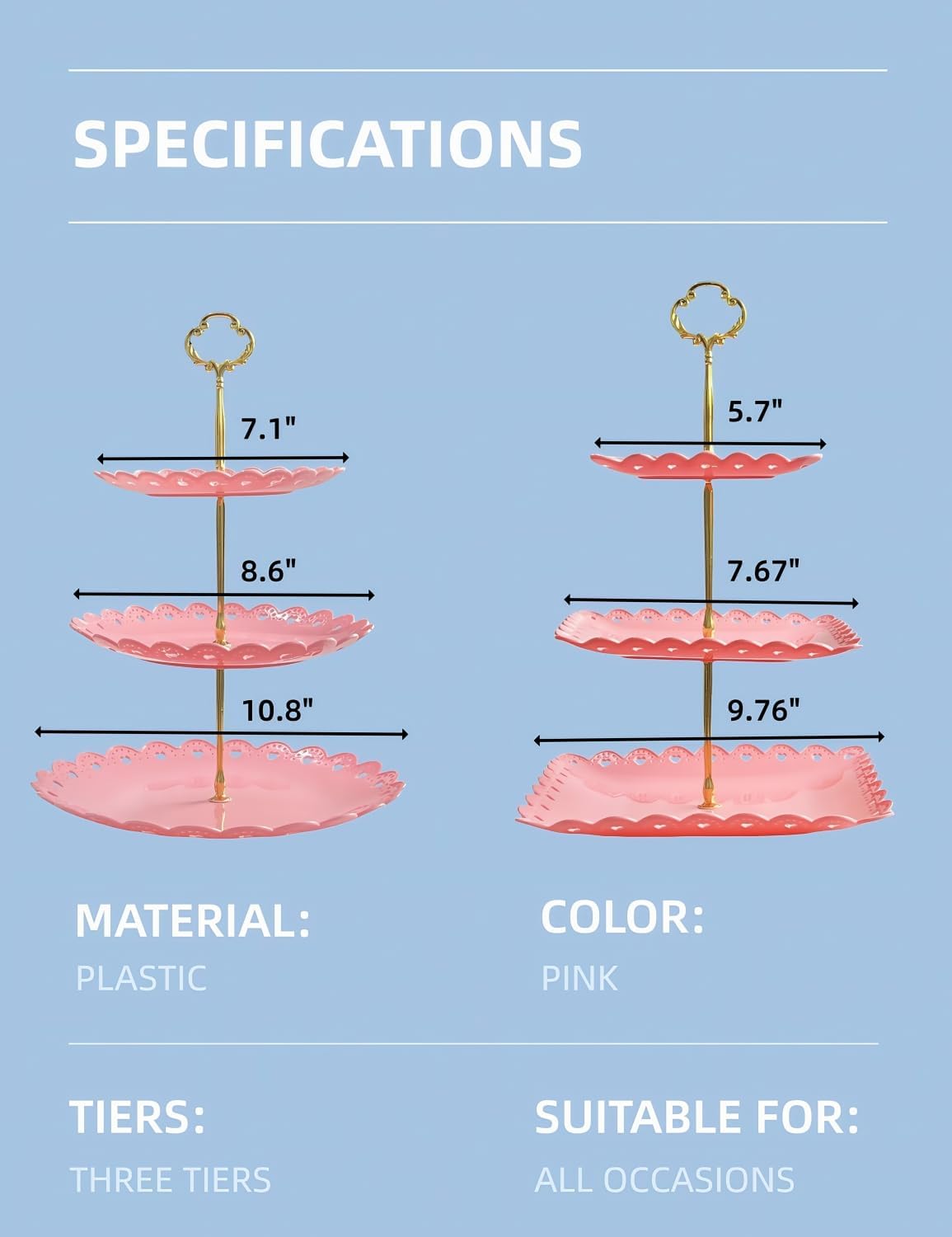 RAUVOLFIA 2 Pack of Plastic Round & Square Dessert Cupcake Stand, 3 Tier Cup Cake Holder Tower for Tea Party/Birthday/Wedding, Plastic Tiered Serving Tray (Pink)