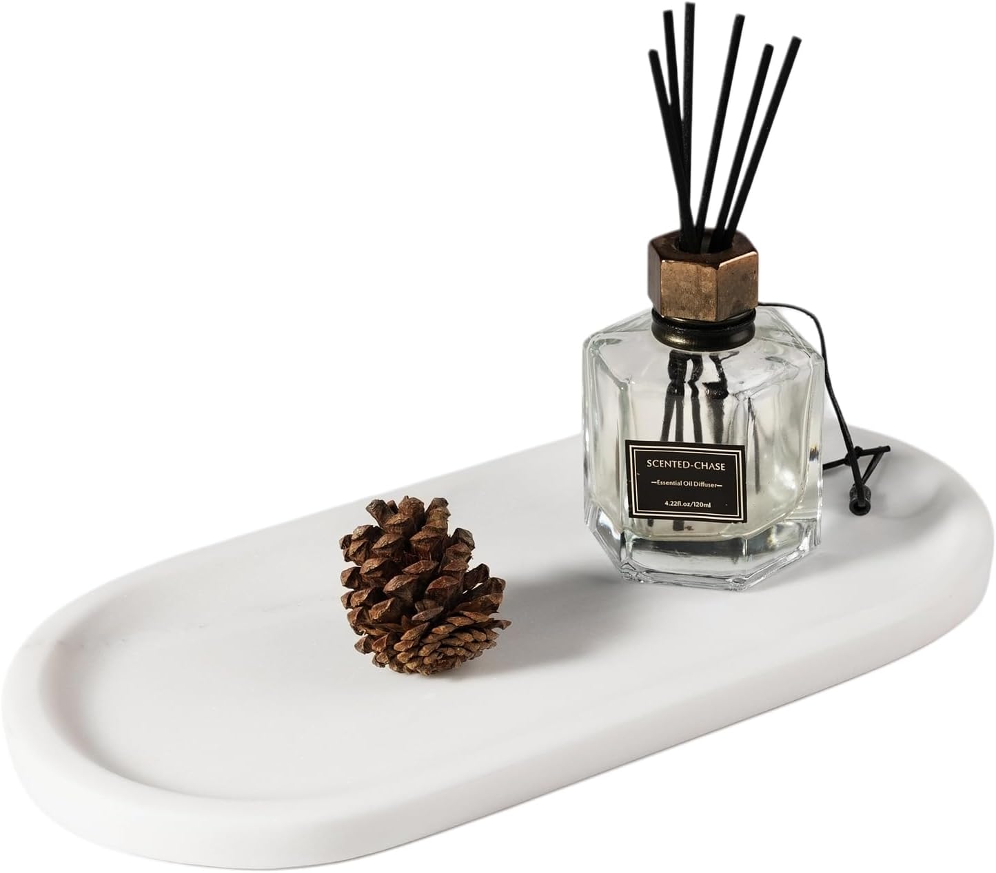Koville Natural Marble Tray for Bathroom Decor Countertop, Vanity Tray Italy Oval Stone Trays for Candles Perfume, Storage Trays for Cosmetics, Jewelry, Decorative Tray for Dresser Organizer(White)