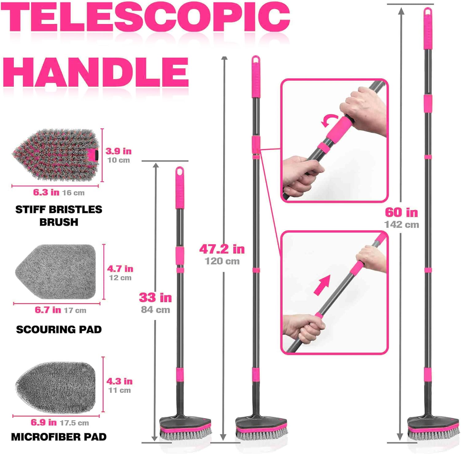 - 4 Replaceable Brush Heads: The shower brush for cleaning is equipped with 4 cleaning brush heads. The microfiber pad tackles sensitive surface; the scouring pad cleans bathtubs and sink; and the stiff bristles brush removes stubborn dirt