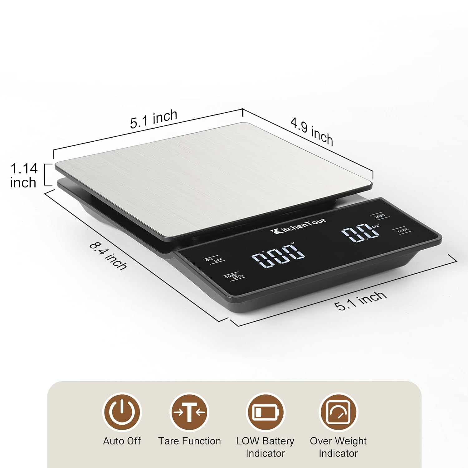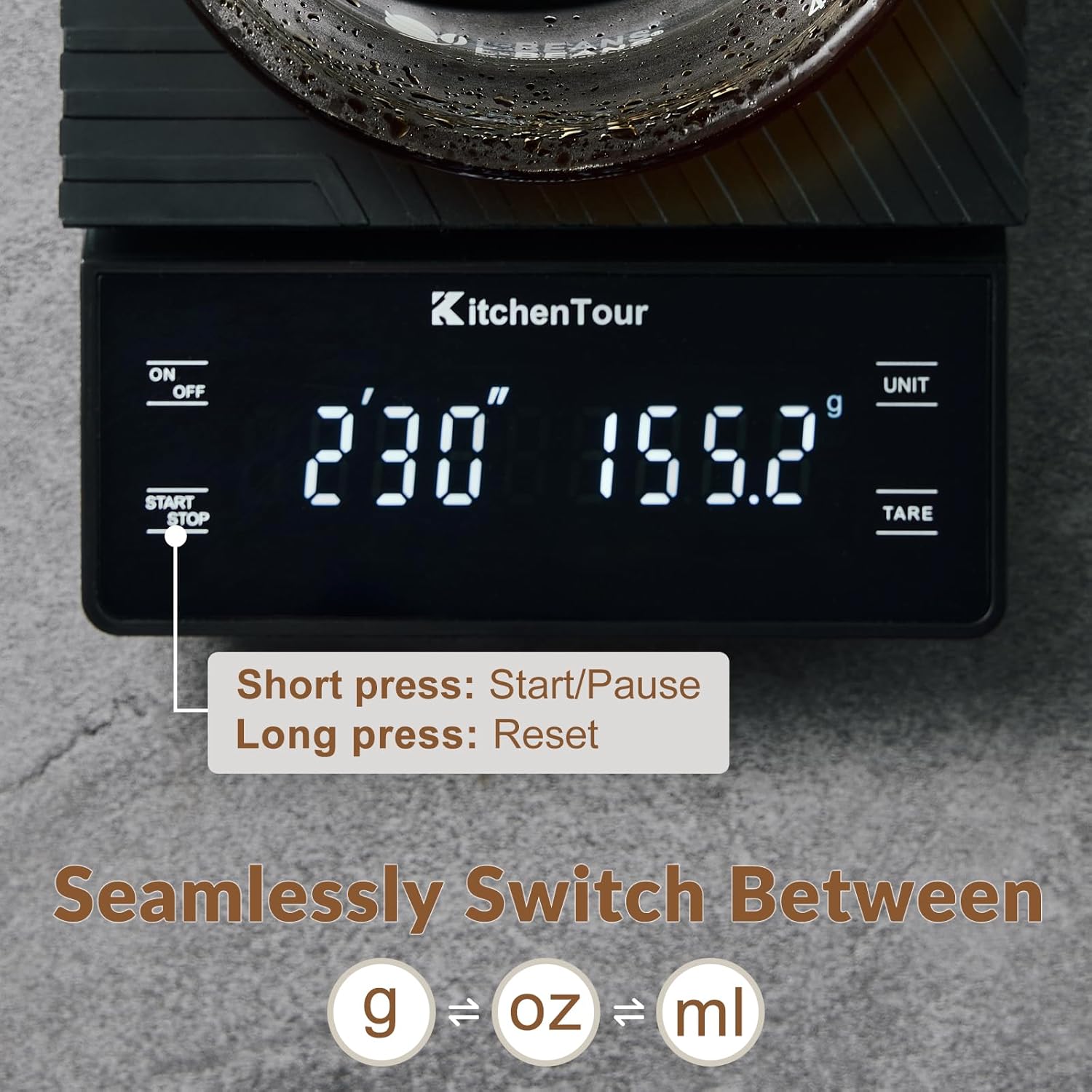 - #UNIT CONVERSION# - KitchenTour High Precision Coffee Drip Scale supports switching of different units of g,oz, ml, which can weigh solids, liquids, powders. The touch activated keys also make for an elegant and clean design. With the back-lit reverse LCD display, weighing is quick and easy.