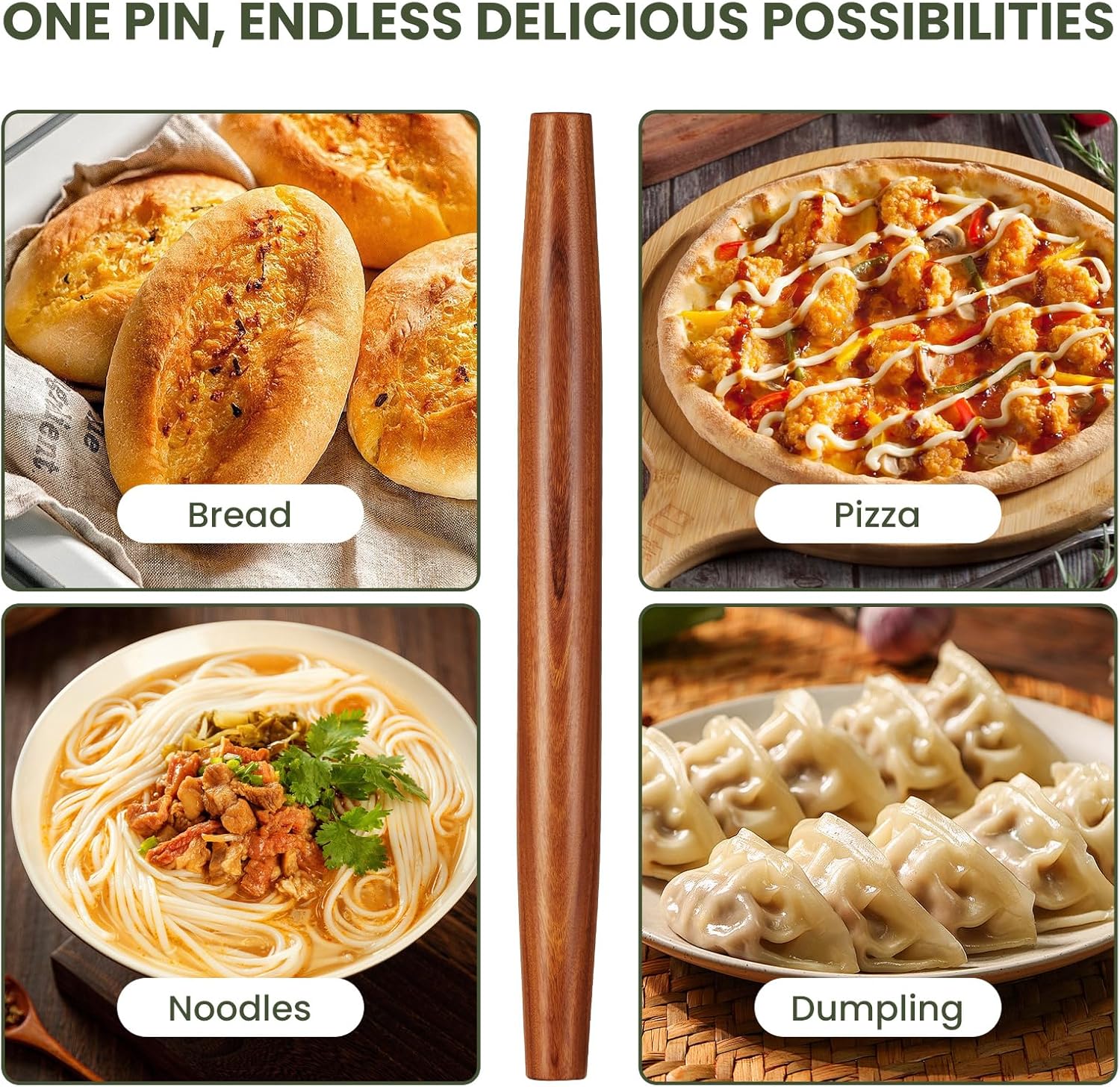 - KITCHEN ESSENTIALS :This french rolling pin is perfect for family baking sessions,Whether you're making cookies, pizza, pie crust, fondant, pizza dough, bread, biscuits, and pie crust or more. Every kitchen should have this tool.
