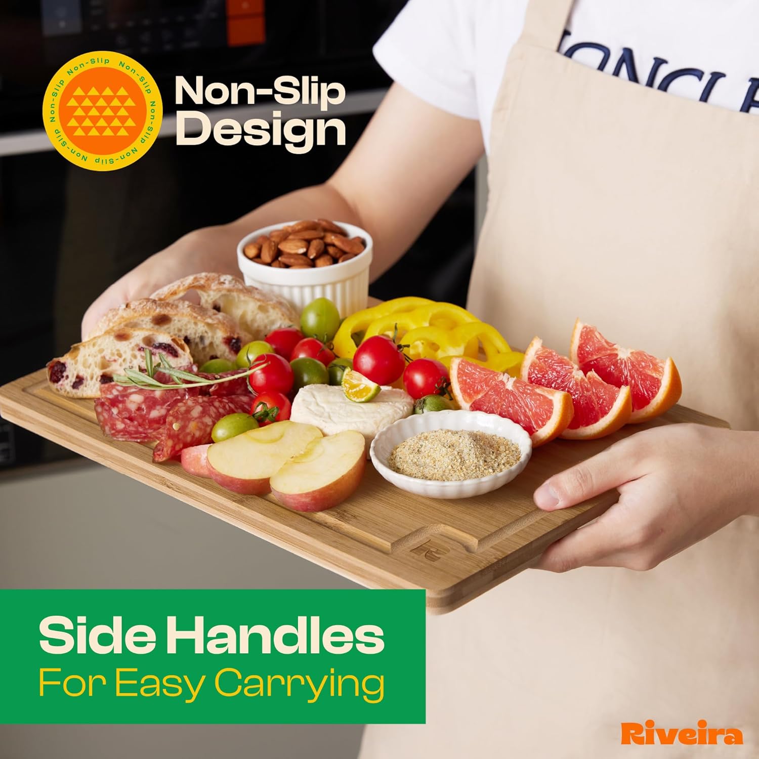 - No Mess Cutting and Transfer — Enjoy a mess-free kitchen with our Brown large bamboo cutting board. Equipped with deep juice grooves, these wooden cutting boards set catch liquid runoff from meat and fruit, preventing spills and countertop messes. Whether you're working in an industrial restaurant kitchen or your home, this dark wood cutting board set of 2 makes cleanup a breeze. Transfer ingredients from your prep station without any fuss with Riveira nice cutting board set for different foods.