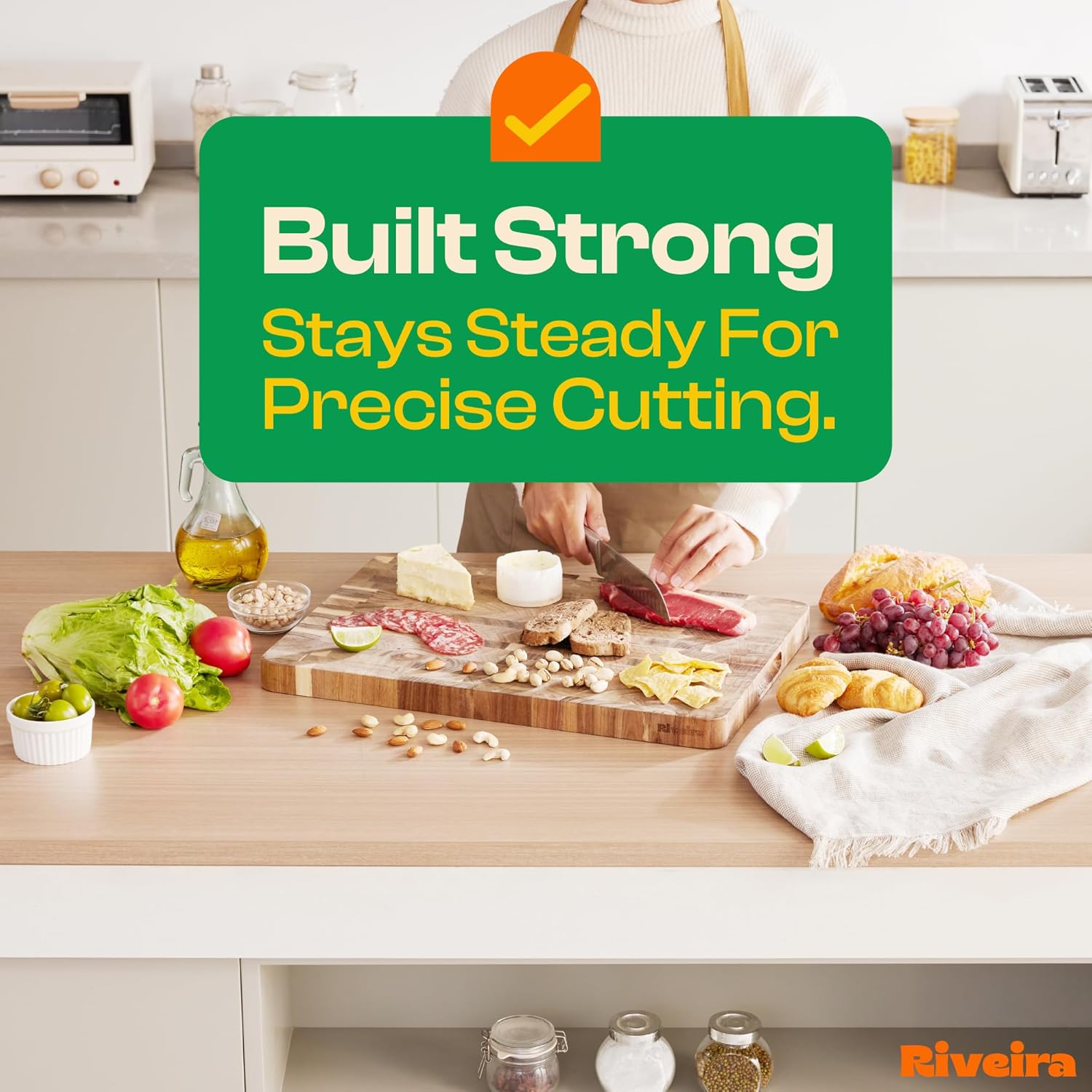 - Premium Crafted Acacia — Take a detour from traditional kitchen aesthetics with this acacia wood board crafted from 100% natural acacia. Beyond being an unconventional and eco-friendly choice, the chopping board wood proudly showcases the environment friendly and organic acacia. This wood cutting boards for kitchen counter adds an unexpected touch of confidence and style to your once-orderly culinary space. Riviera's wooden chopping boards for kitchen will be there for you for many years.