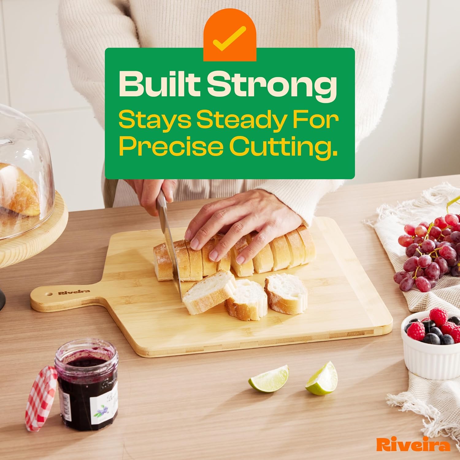 - Premium Crafted bamboo — Take a detour from traditional kitchen aesthetics with this two tone bamboo wood board crafted from 100% natural bamboo. Beyond being an unconventional and eco-friendly choice, the chopping board wood proudly showcases the environment friendly and organic bamboo. This wood cutting boards for kitchen counter adds unexpected touch of confidence and style to your once-orderly culinary space. Riviera's wooden chopping boards for kitchen will be there for many years to come.