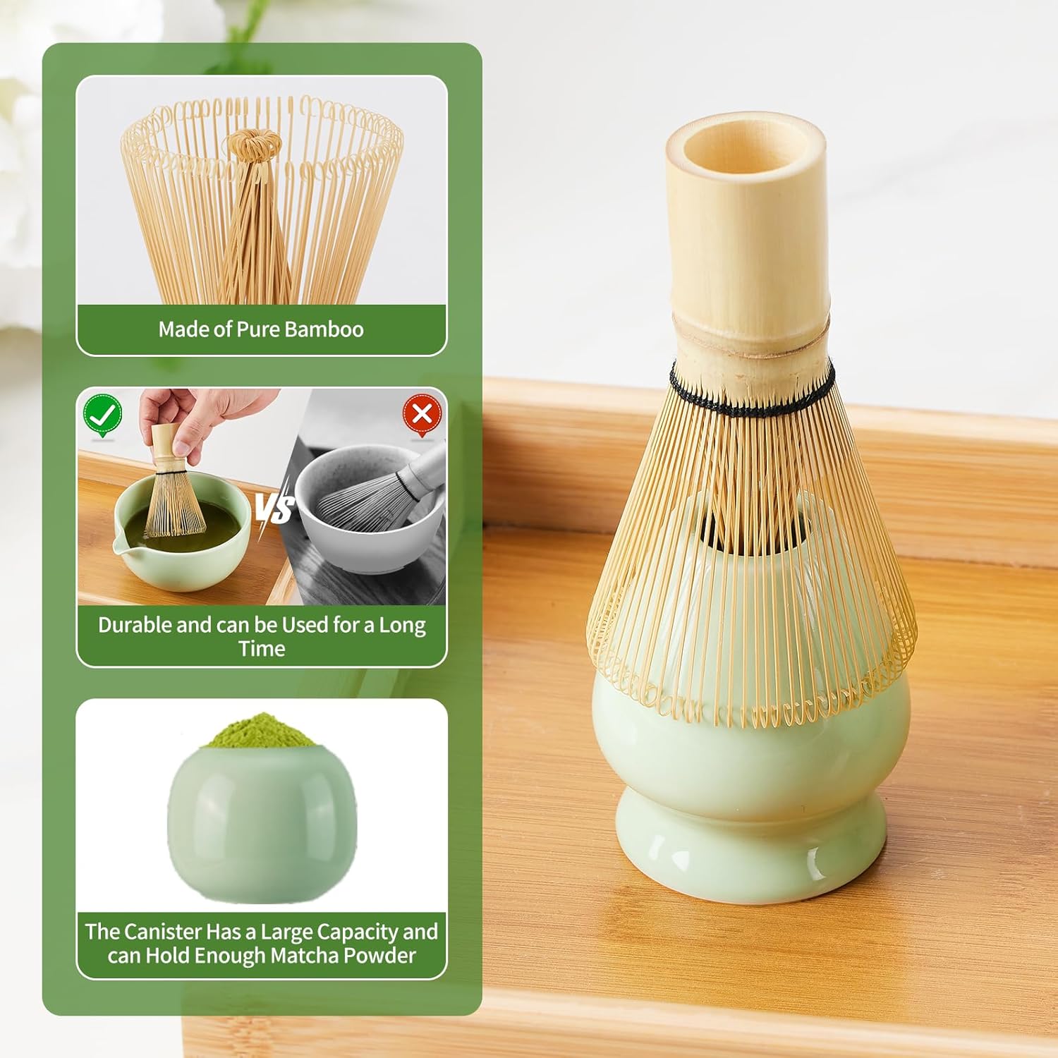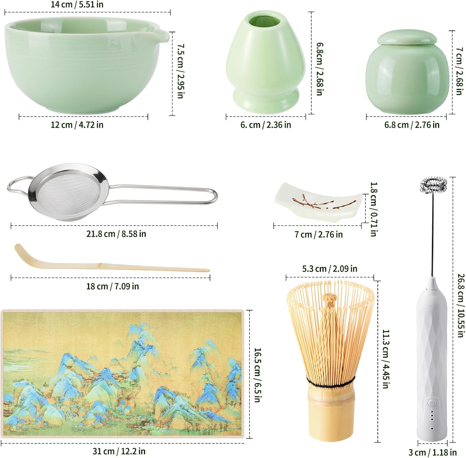 - 【Matcha Whisk Set】1 * Matcha whisk (Chasen), 1* matcha bowl with spout (Chawan), 1* ceramic whisk holder, 1* bamboo scoop (Chashaku), 1* tea cloth (Chakin), 1* scoop holder(Ceramic Stand), 1* matcha powder sifter, 1* 110ml matcha powder Canister, 1* rechargeable electric frother (no batteries required), 1* user's mannual.