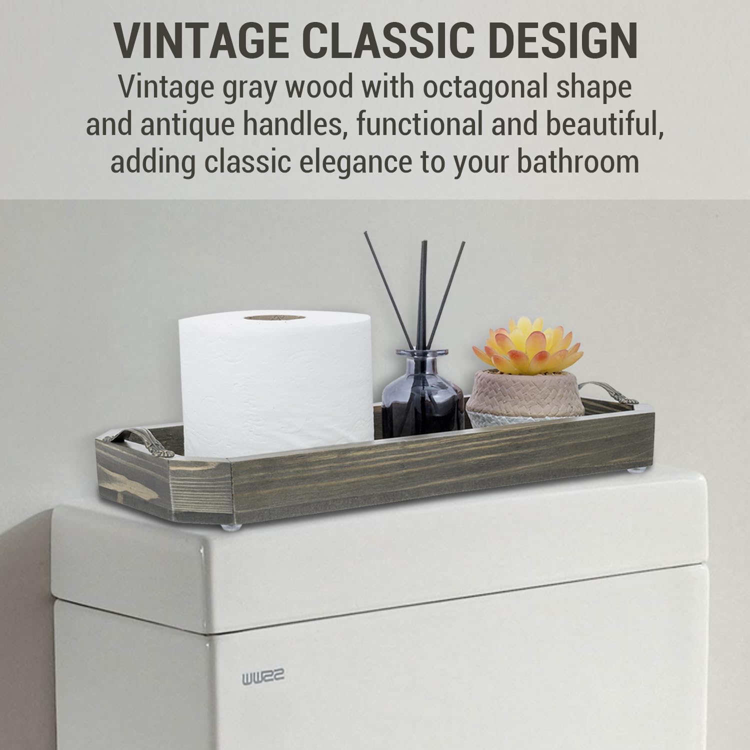 MyGift 2 Piece Narrow Wooden Vanity Tray, Vintage Gray Solid Wood Toilet Tank Tray, Decorative Octagonal Cosmetic Organizer with Antique Metal Handles