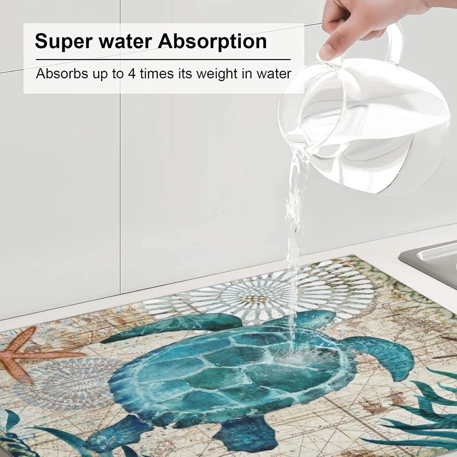 Ocean Sea Turtle Dish Drying Mat for Kitchen Counter 18x24 in, Retro Map Microfiber Drying Mats Absorbent Reversible Dish Pad Large Dish Draining Mat Fast Dry Kitchen Accessories
