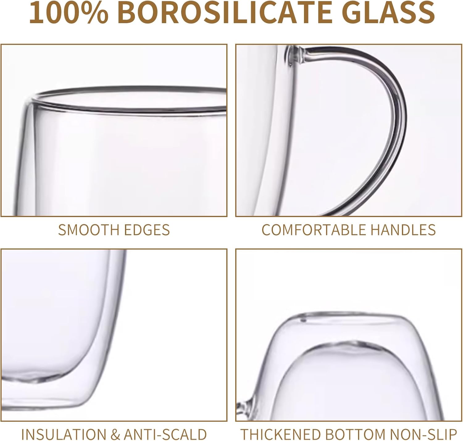 - CUTE GLASS COFFEE MUGS, ENJOY LIFE: Double walled, Glass material,you can enjoy your cup of coffee, espresso, cappuccino or tea. When you have hot coffee, you won’t feel hot from outside and when you have cold drink,there is no condensation on the glass and table.