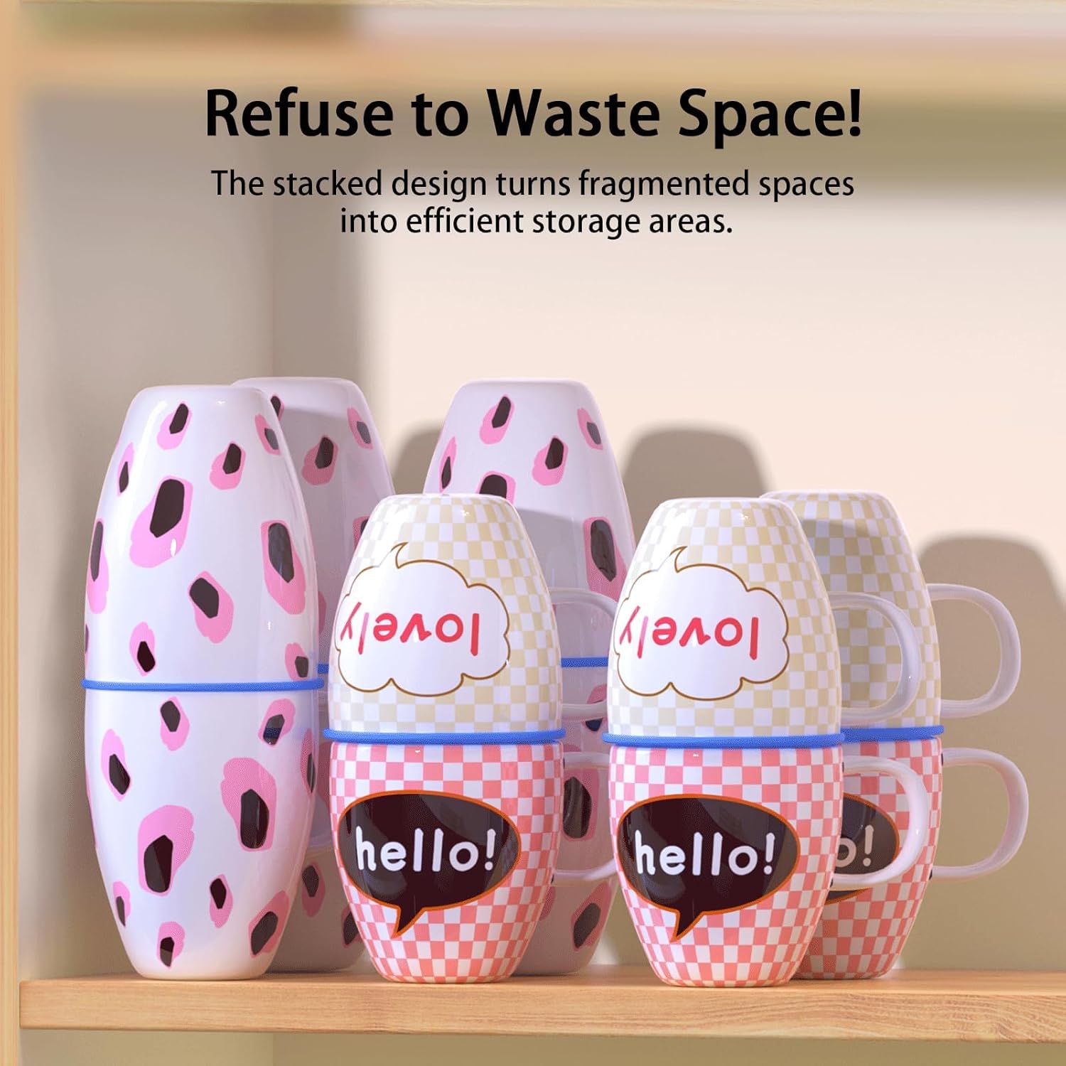 - Easy to Use & Setup – Simply place one Stacker on top of a cup, then place another upside-down on top. Gently squeeze the stacker to adjust it to the size of your mugs, and you’ll have a secure and organized storage solution in no time. 🔔For use only with round-mouthed cups with diameters between 1.5-3.9" (3.8-9.9 cm)