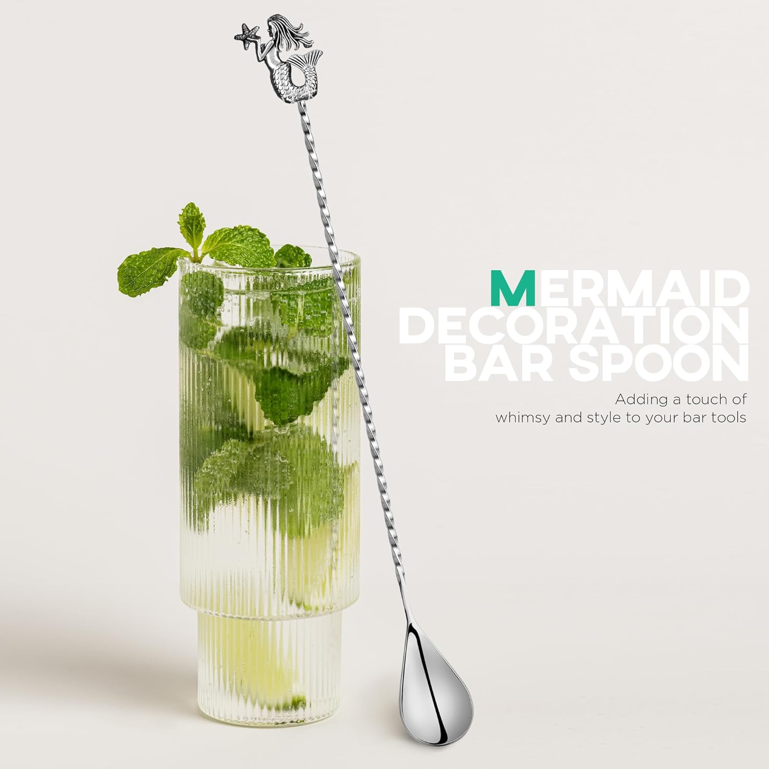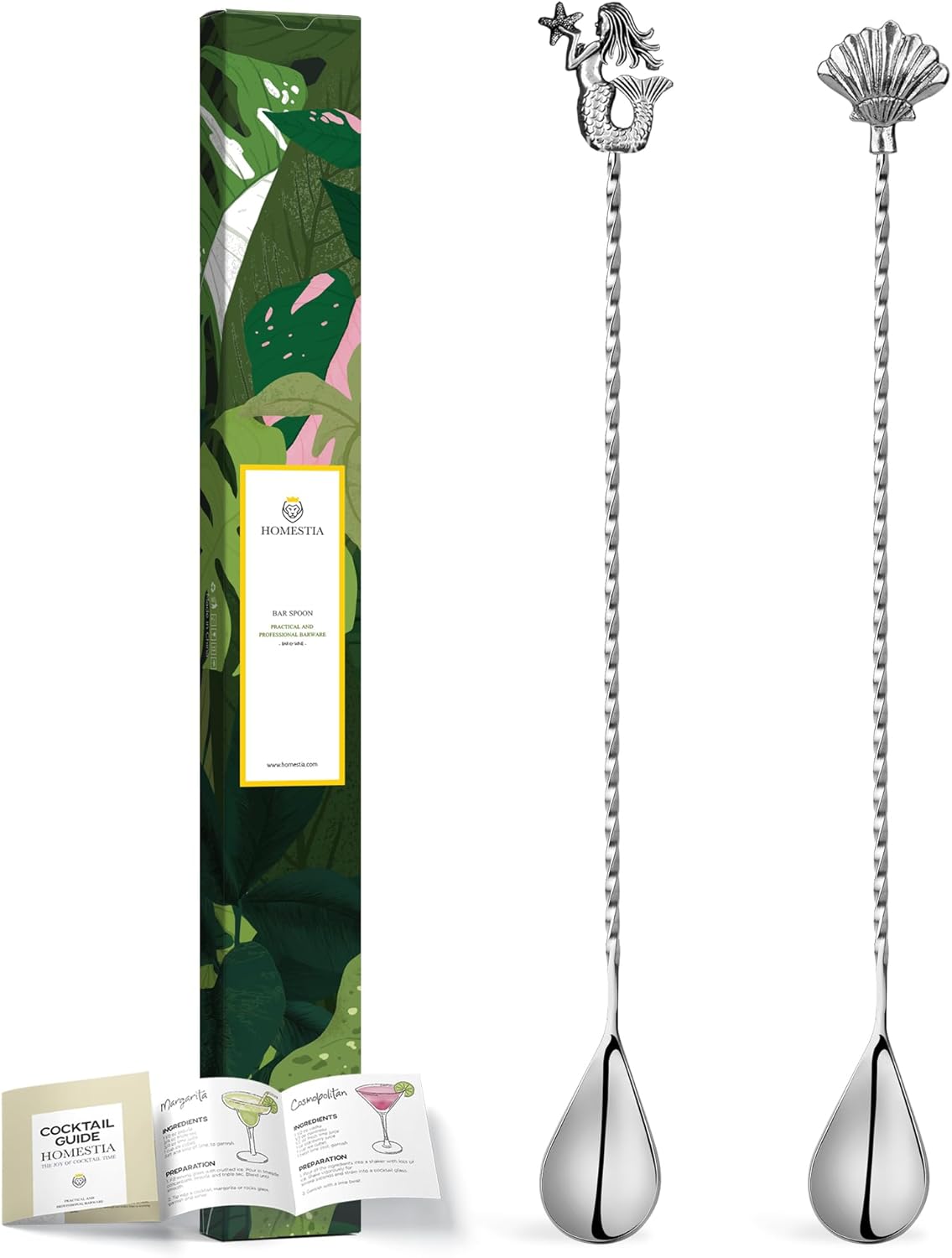 Homestia 12'' Cocktail Mixing Spoon Set, Food-Grade Stainless Steel Stirrer Spiral Pattern Bar Cocktail Shaker Spoon for Ice Cream Smoothies Juice Coffee Tea Drink (Mermaid, Shell Handle) - Set of 2