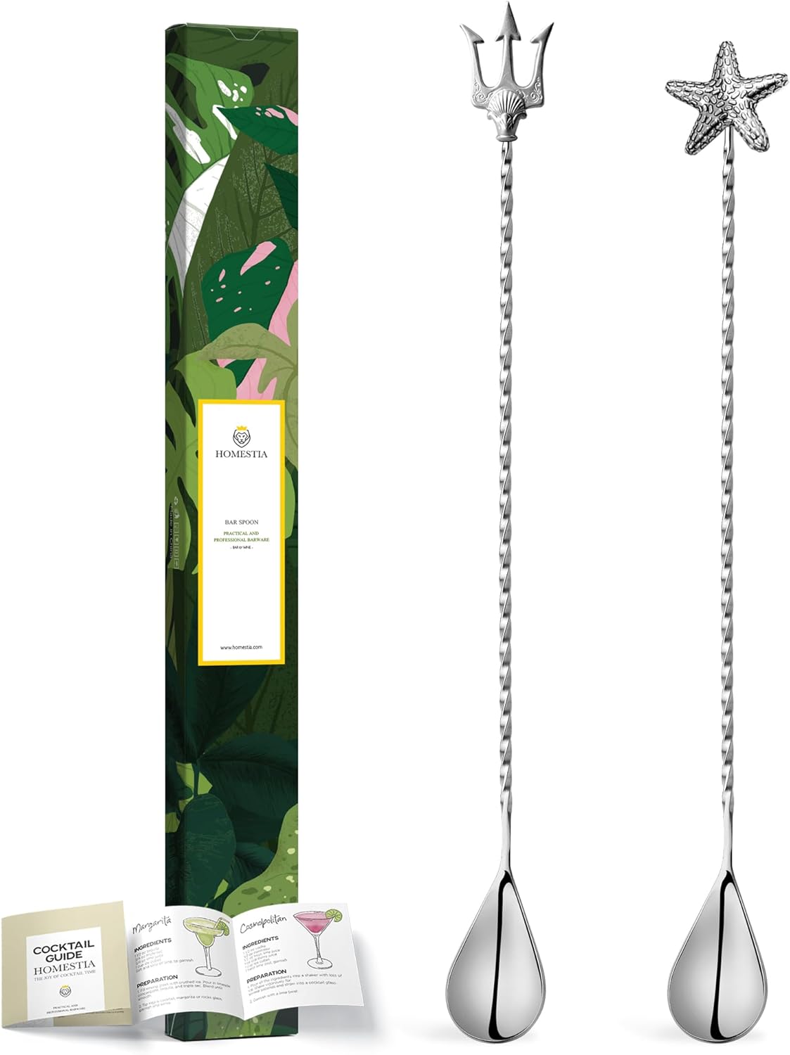 Homestia 12-Inch Ocean Series Bar Spoon, 304 Stainless Steel Cocktail Spoon for Layering Long Spiral Handle Mixing Spoon Stirrers for Drink, 2PCS Silver (Starfish and Trident)