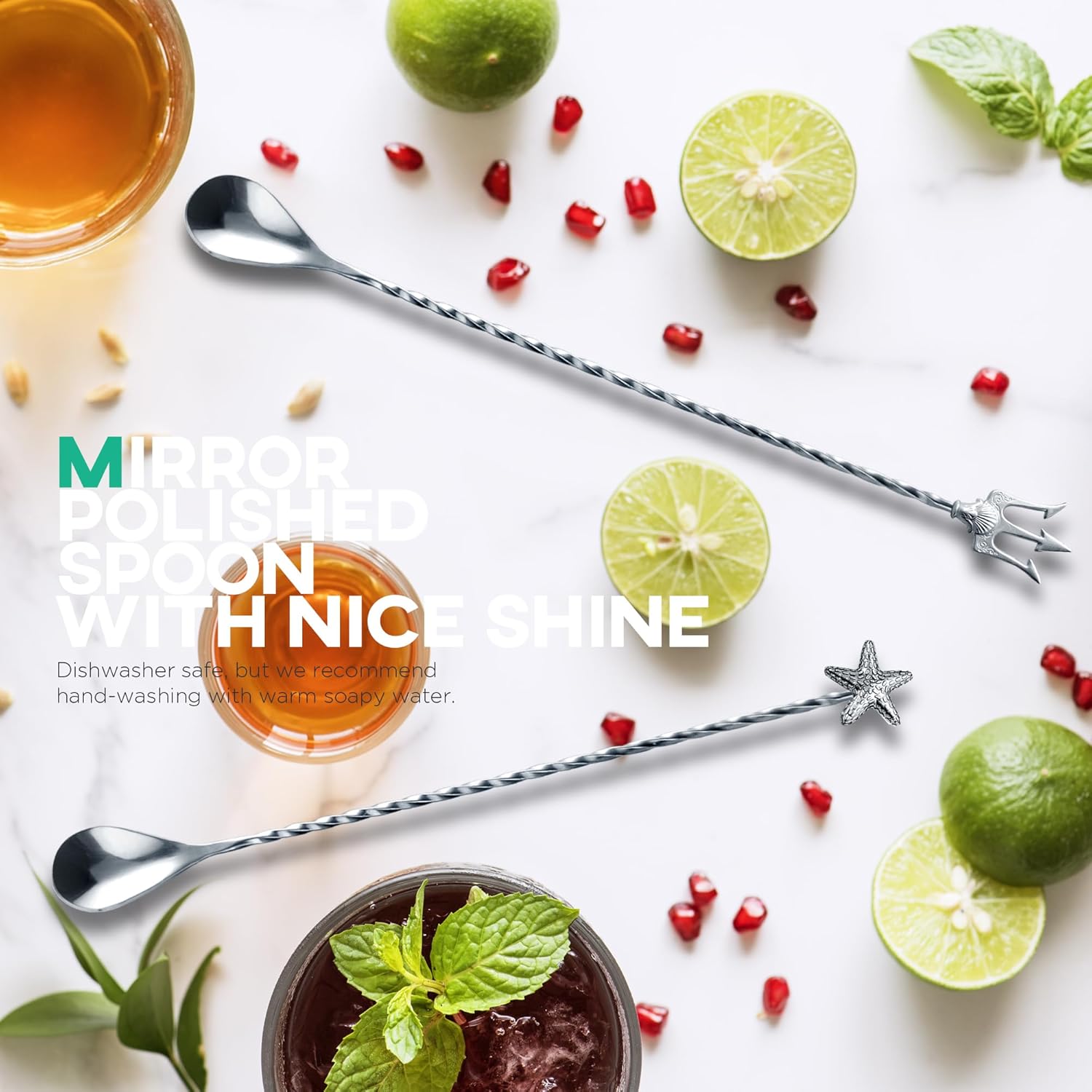 - OPERATION: The zinc alloy starfish / trident decoration on the top of the spoon adds a unique and charming style to your bar tools, and a spiral shaped rod in the middle for better control and grip, designed to spin effortlessly. Perfect for stirring drinks, mixing cocktails, juices, smoothies or milkshakes.