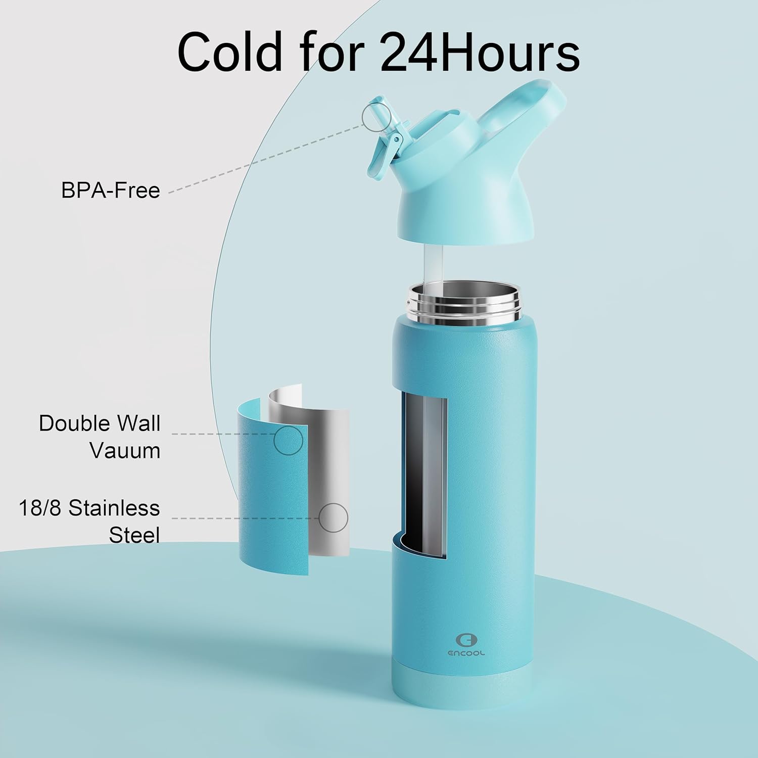 Insulated Water Bottle with Straw - Encool Stainless Steel Water Bottle, Reusable Leakproof and BPA-Free for Sports, Travel, Cold for 24 Hours, 24 oz, Mint Green
