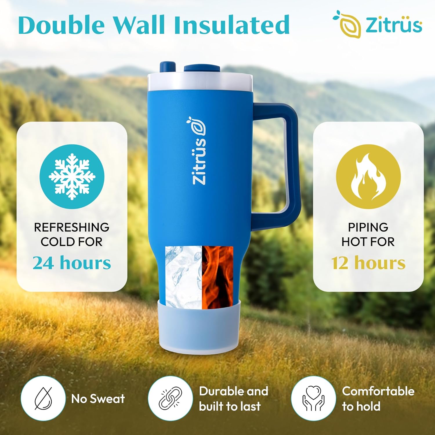 - LEFT-HAND & RIGHT-HAND FRIENDLY LID DESIGN: With a double-threaded lid, Zitrüs offers ergonomic comfort for both lefties and righties by simply adjusting the lid. Whether you're holding the handle or sipping through the straw, this insulated tumbler with handle delivers flexible hydration that fits your lifestyle. Designed to be your everyday water bottle with handle and straw.