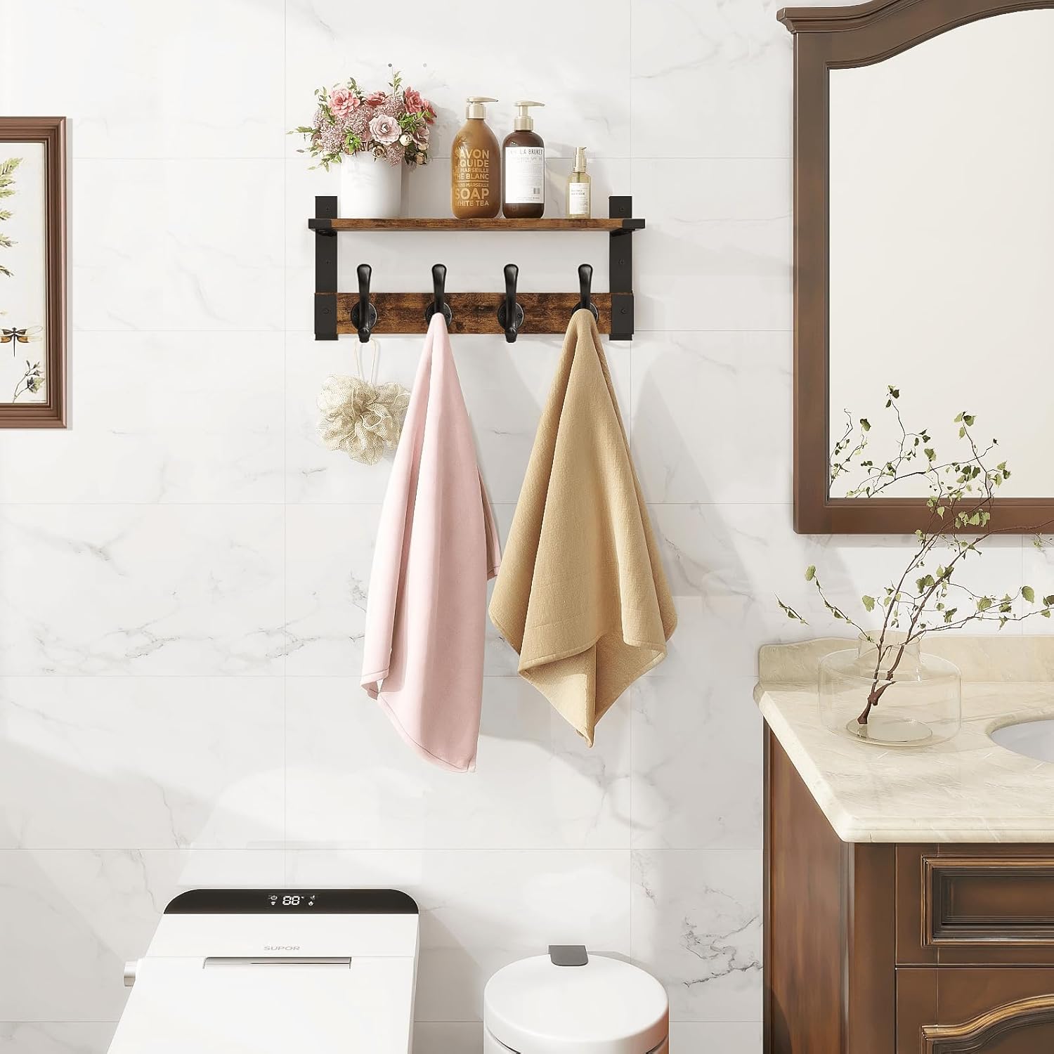 - 2-IN-1 DESIGN:2 in 1 wall hooks with shelf have functions both hang & display; It features a spacious 4.52-inch deep floating shelf, perfect for showcasing decorative items like photo frames, potted plants, or mail envelopes, while featuring 4 dual metal hooks for practical hanging storage in your entryway or hallway. Suitable for living room,laundry room,bathroom and kitchen, etc