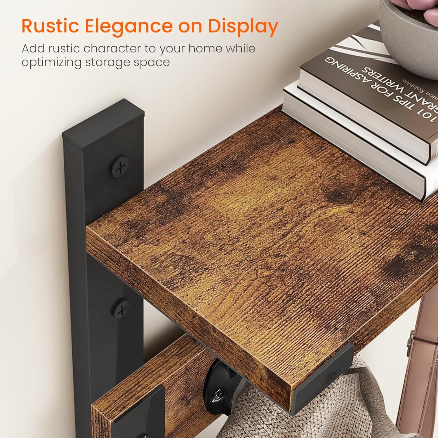 - Versatile Uses: The rustic wood shelf with hooks is seamlessly blending with various home decors, from modern to rustic while ensures all your essentials are organized and easily accessible; Ideal for any space needing a blend of storage and style