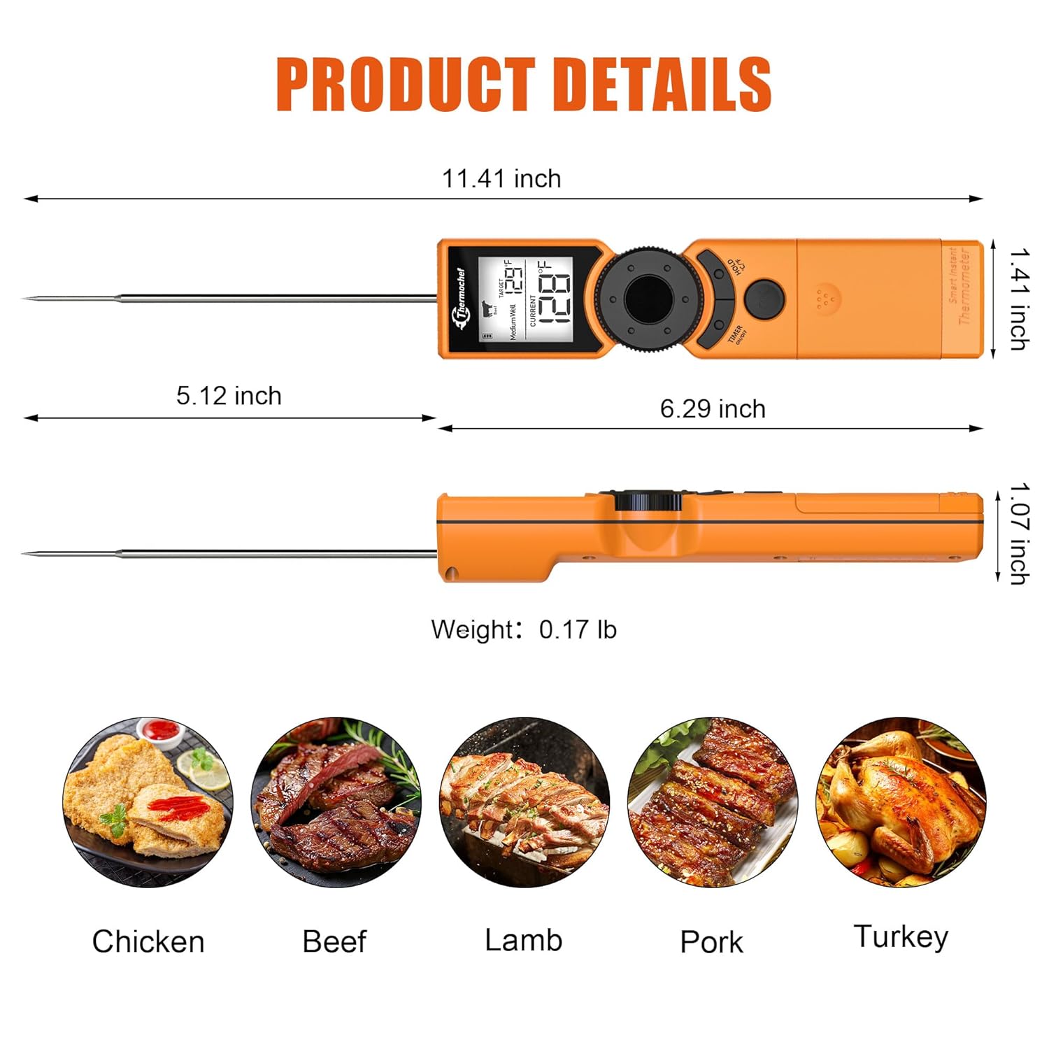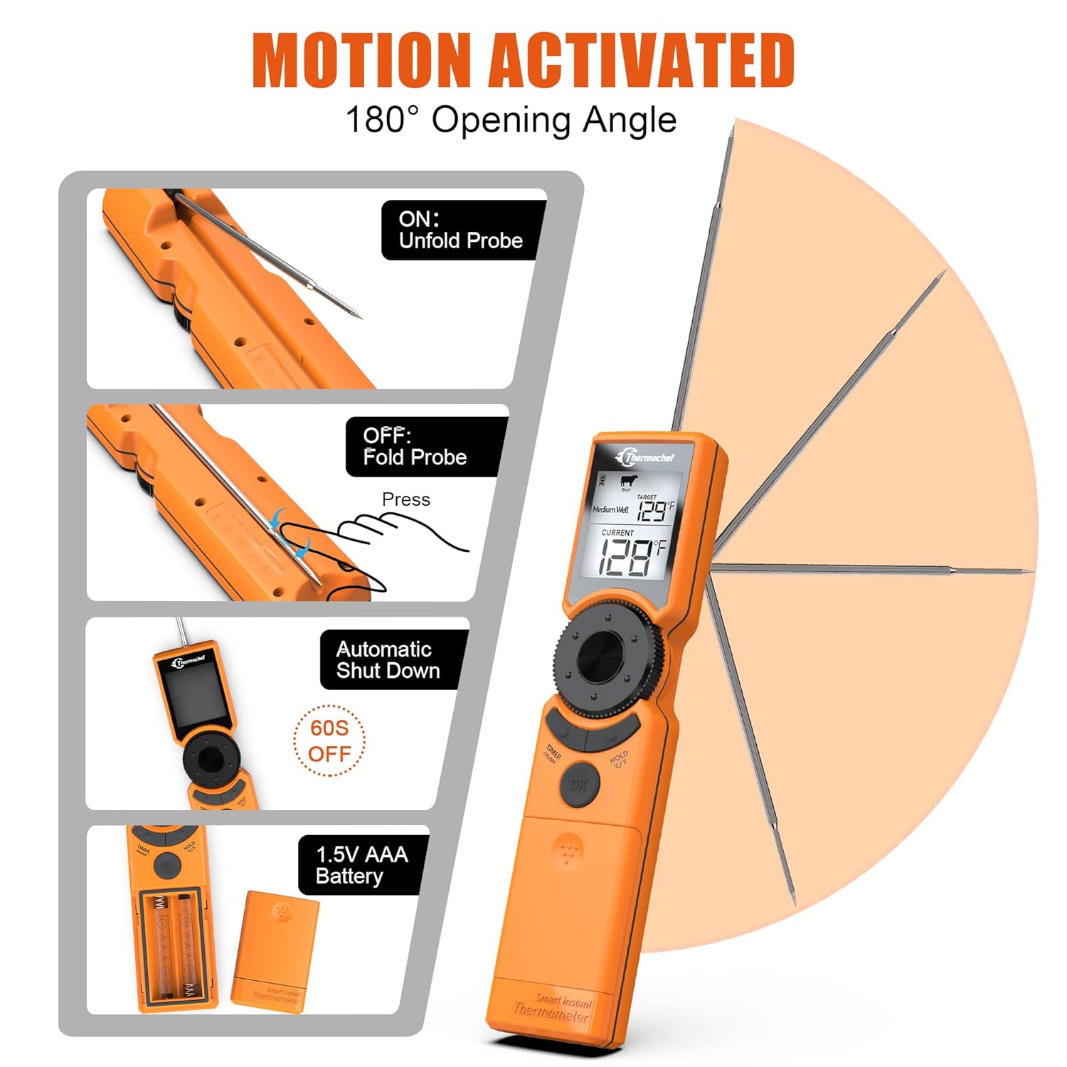 - 【Lasting Battery Performance】: The grill thermometer for outside grill, with a food - grade stainless steel probe and powered by two AAA batteries, offers up to 600 hours of battery life. The digital meat thermometer has a smart power - saving system, auto - shutting off after 60 seconds inactivity to save battery. The foldable probe has an auto - sensing on/off feature: unfold to start, fold to standby for easy use