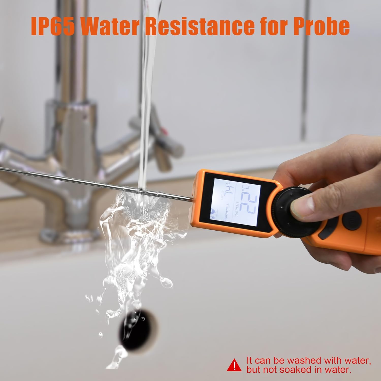 - 【Professional-Grade Accuracy】: Our digital meat thermometer features industrial-grade sensors and factory-calibrated precision within ±0.01 ℃ / ℉, ensuring every temperature reading is reliable and consistent. Whether you’re grilling a steak, roasting a turkey, or smoking ribs, our digital thermometer for cooking eliminates the risk of undercooking or overcooking. Even in high-heat environments, the instant read meat thermometer maintains its precision, thanks to a heat-resistant design and temp lock function that freezes readings for easy viewing away from the flame