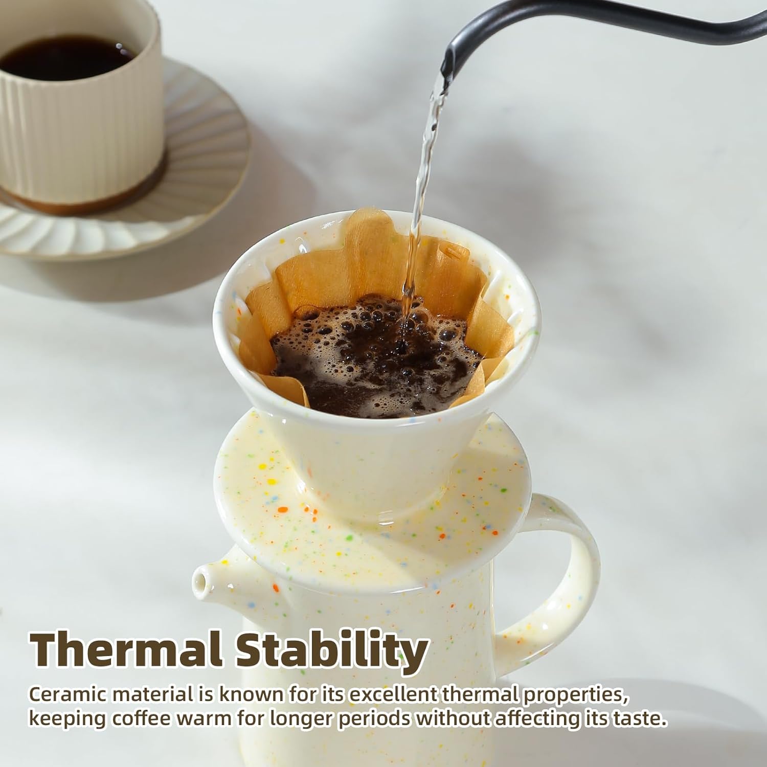- High Quality Material: Drip coffee pour over set made of high tempreture porcelain, with good heat preservation and durability,non toxic,ceramic dripper does not absorb odors or pass on chemical taste into your brew,ceramic design prevents heat loss during brewing.