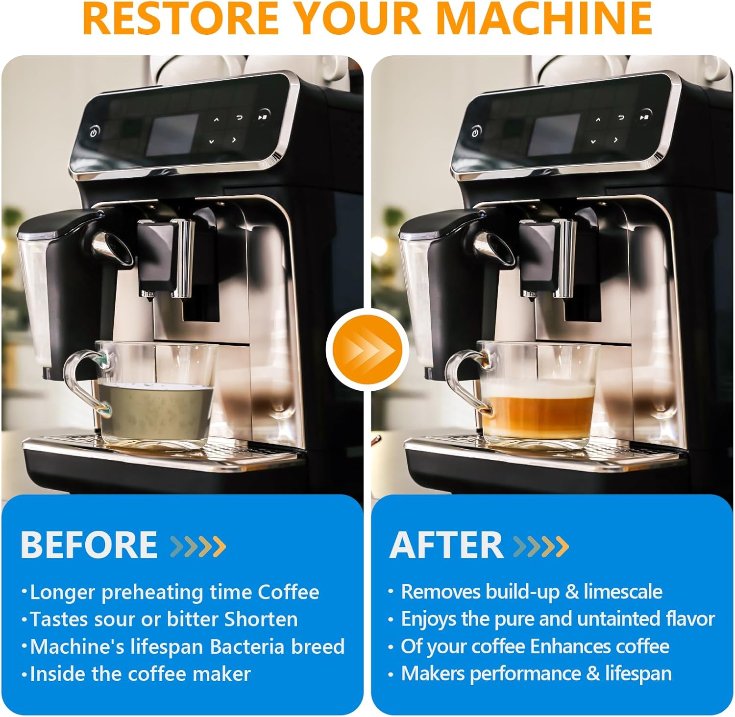 - Powerful Descaling Solution: The espresso machine cleaning maximum efficiency in removing hard water buildup, calcium, limescale, grime and oil that damage the coffee taste in the machine, deeply cleans all internal parts and deodorizes.