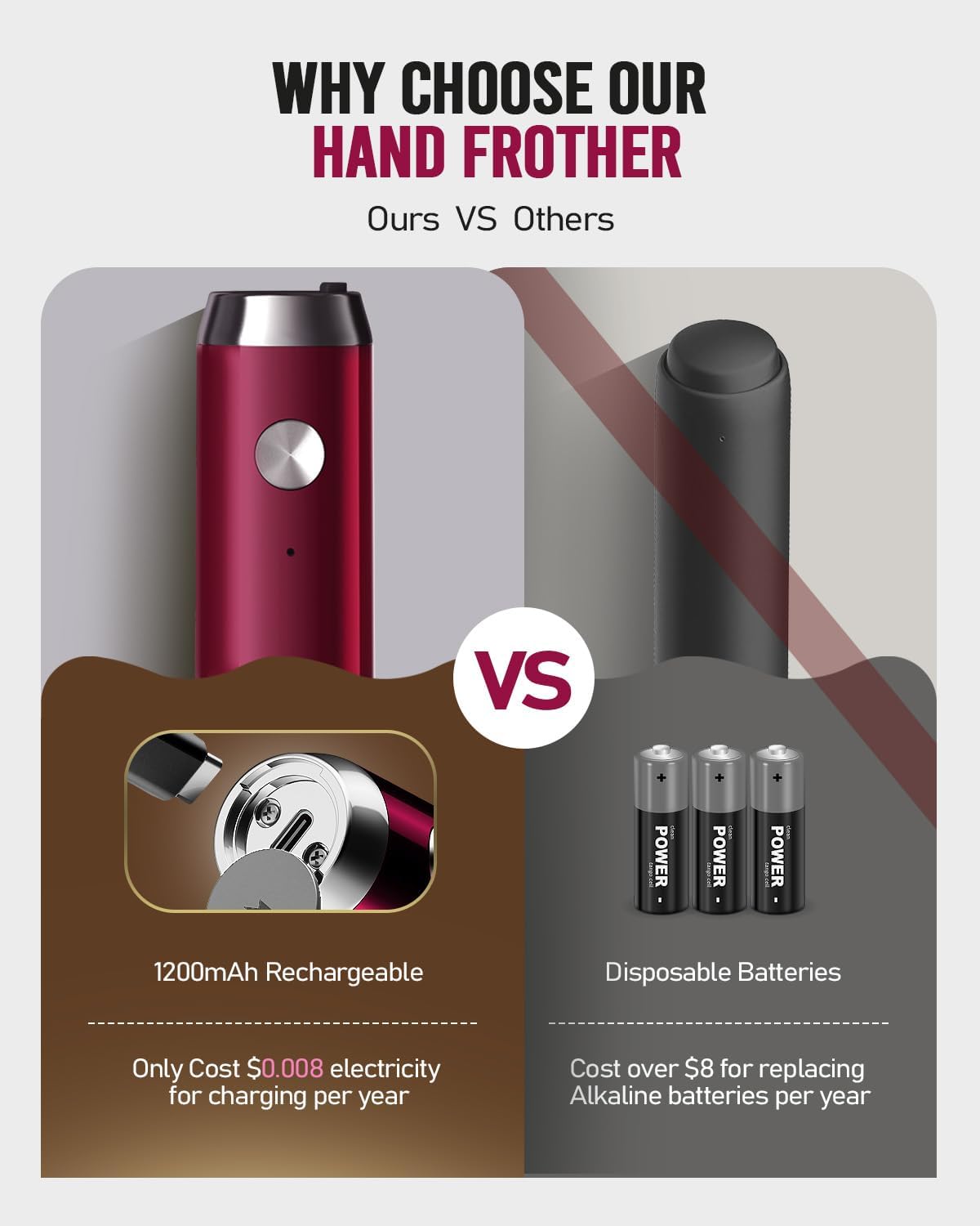 - USB-C Rechargeable for Long Battery Life: Unlike other battery-operated milk frother, this rechargeable milk frother has a built-in 1200mAh lithium battery, so there is no need to replace the battery frequently. This rechargeable foam maker can be fully charged about 3 hours for 1-2 months using(including USB-C charging cable). The white light flashes slowly when charging, and turns off after being fully charged.