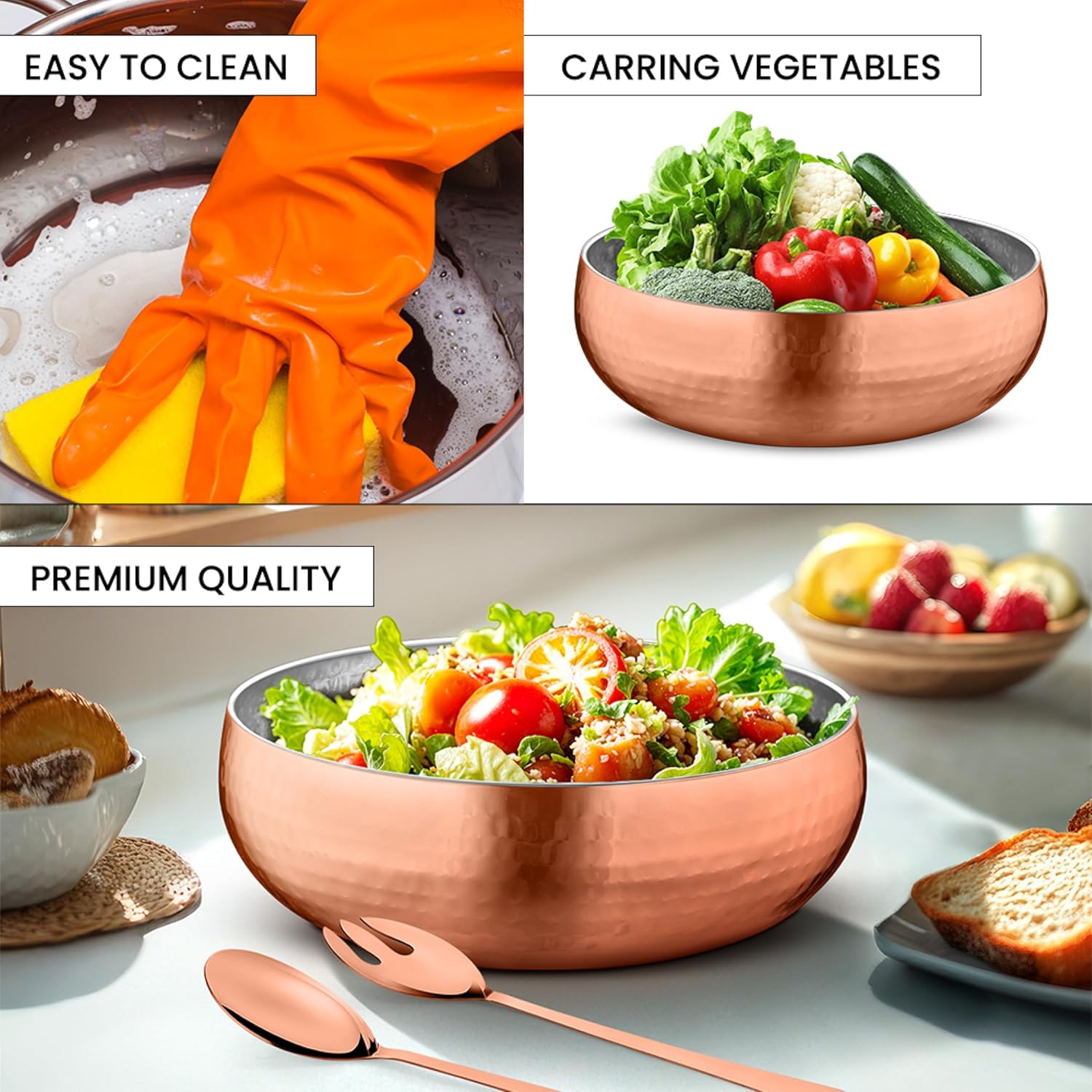 Avador® Set of 3 Premium Stainless Steel Salad Mixing Bowl Hammered Finish | Handmade | Includes Salad Serving Utensils (Rose Gold)