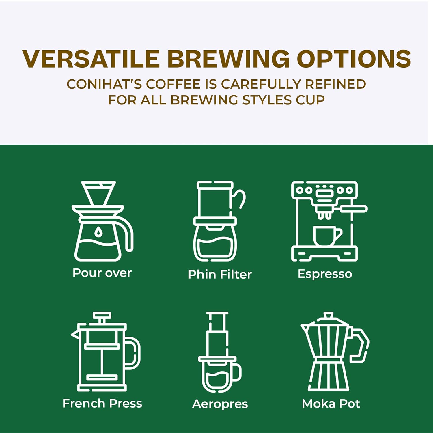 - CRAFTED FOR PERFECTION & VERSATILITY: Expertly roasted in small batches to bring out the best in every bean. From espresso to pour-over, drip, cold brew, or phin, Conihat coffee is carefully refined for all brewing styles—authentic Vietnamese coffee with a universal touch for your everyday routine.