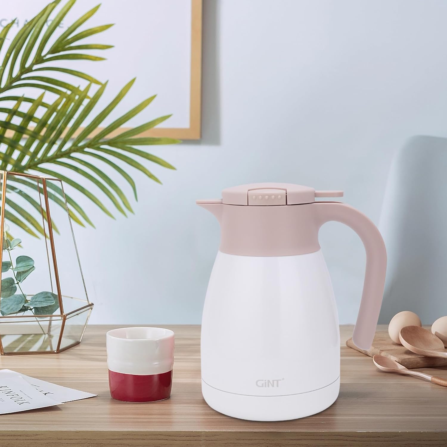- USER FRIENDLY: GiNT 34oz thermal carafe features extra wide top opening, easy for cleaning and adding ice cubes; Simple-push button enables single-hand pouring without leaking, dripping or spilling; Ideal used for bedside, restaurant, office, party, camping, travel insulated coffee carafes.