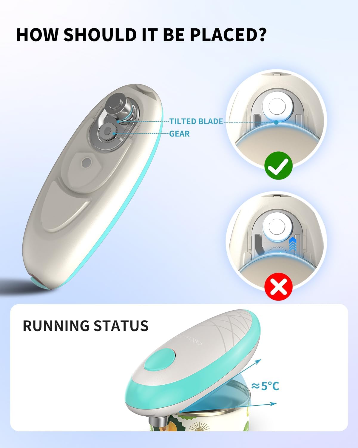- One Touch Operation - Hands-free and mess-free. This electric can opener makes opening cans as easy as pushing a button. Simply press the button, the opener will slide along the rim of the cans for a clean cut. Press the button again and waitting for 2 seconds, and you're done opening cans. (Note: It requires manual stopping)