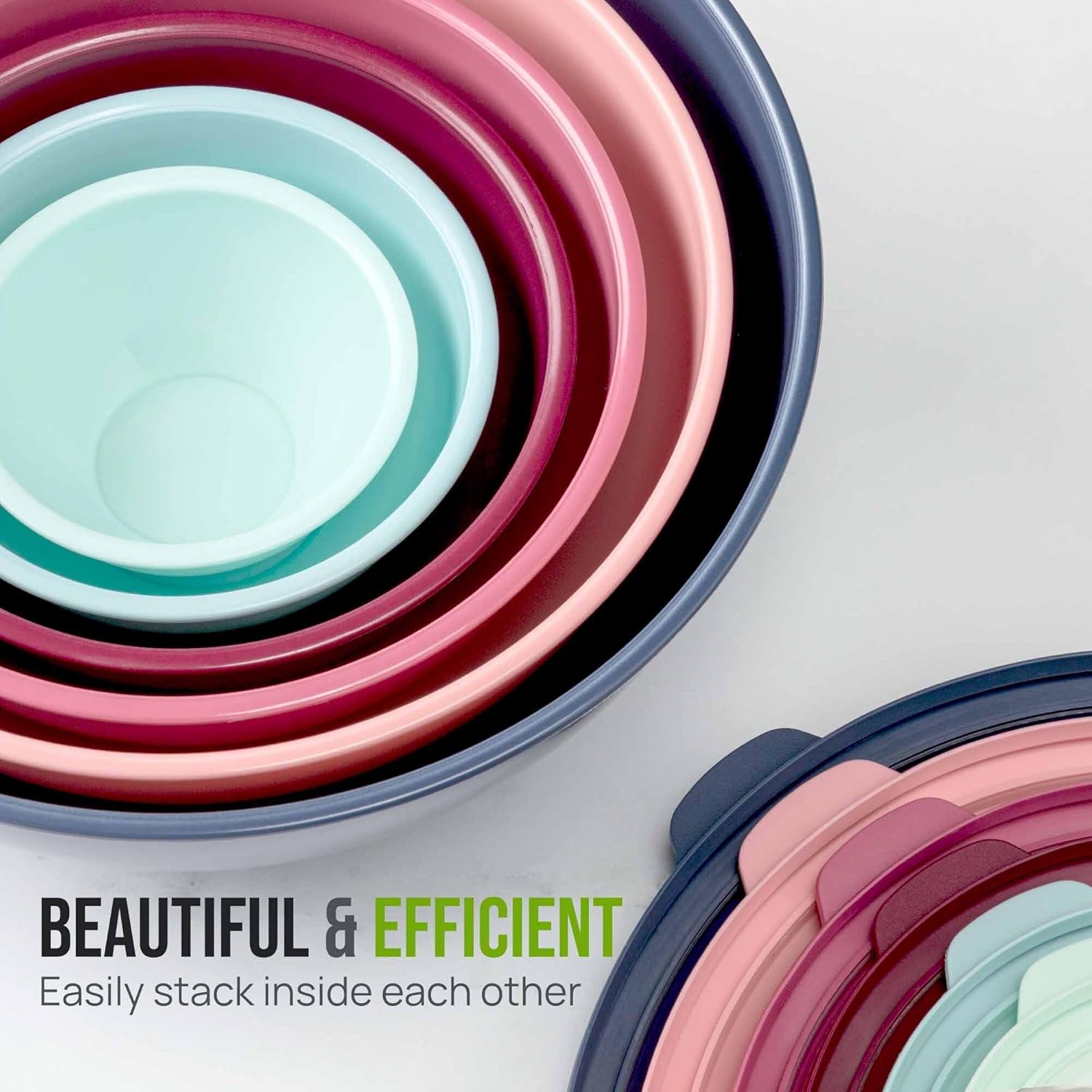 - STACKABLE, EASY TO CLEAN DESIGN: These nesting mixing bowls for kitchen can be stacked on top of each other to save space. The plastic bowls with lids are top-rack dishwasher friendly and can also be hand washed with soap and water (avoid the use of abrasive sponges).